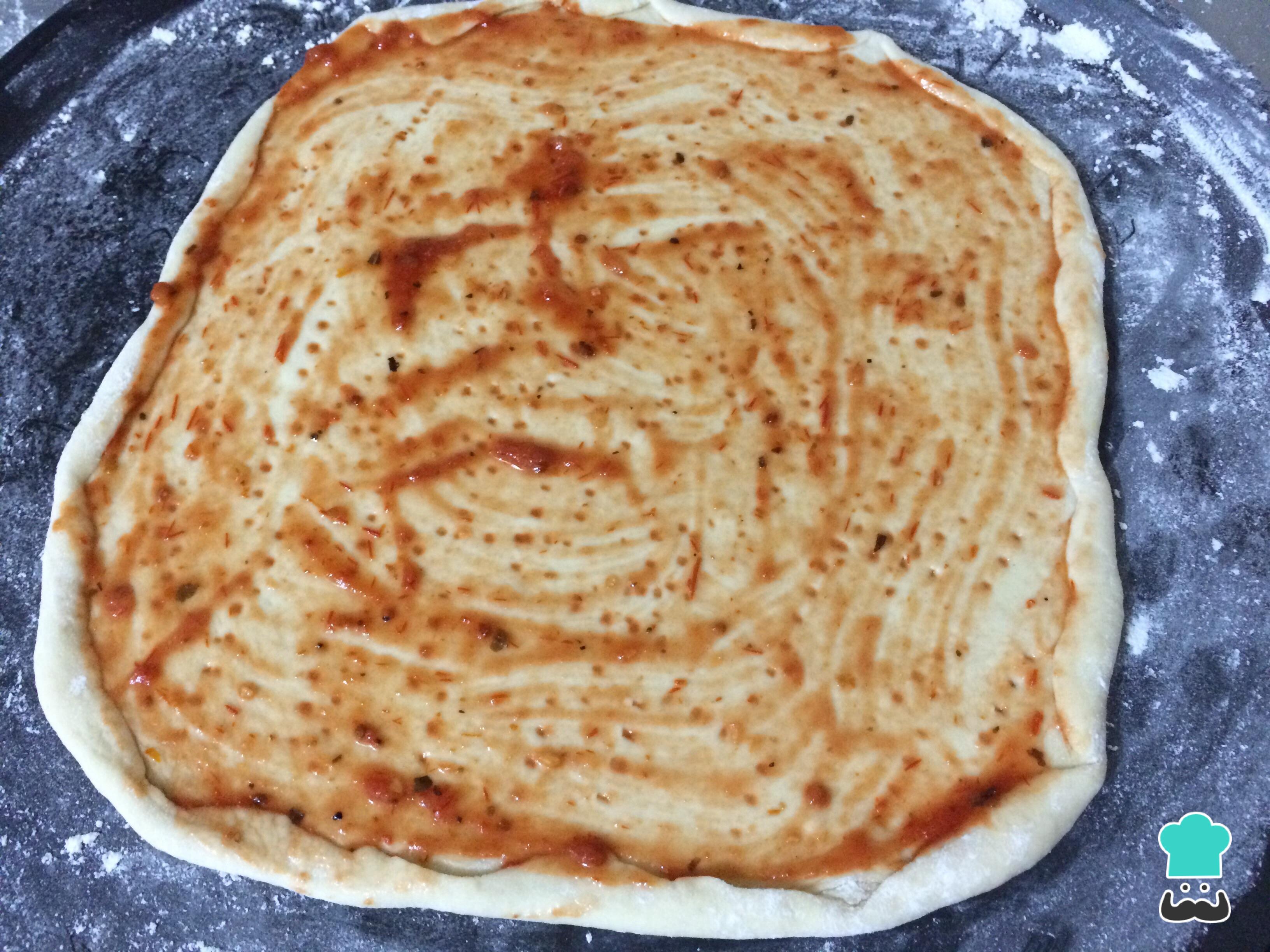 Cuando la masa haya leudado, en una superficie con harina, desgasificarla con los dedos (sacar todo el gas que obtuvo la masa durante el leudado), estirar la masa y doblar las esquinas hacia dentro, con un pincel añadir un poco de salsa napolitana y pincharla para que no se infle en el horno. Prehornear la pizza durante 5 minutos a 200 grados C.