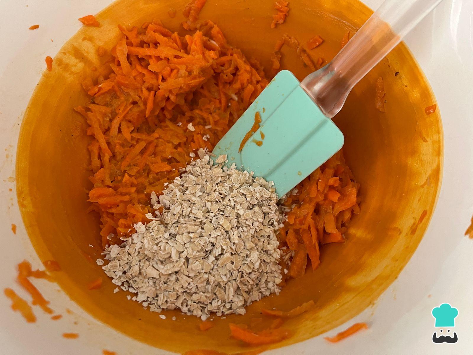 Cuando hayas integrado la zanahoria con los huevos, agrega la avena poco a poco hasta obtener una consistencia cremosa. También puedes usar harina de garbanzos si prefieres hacer esta preparación sin TACC.