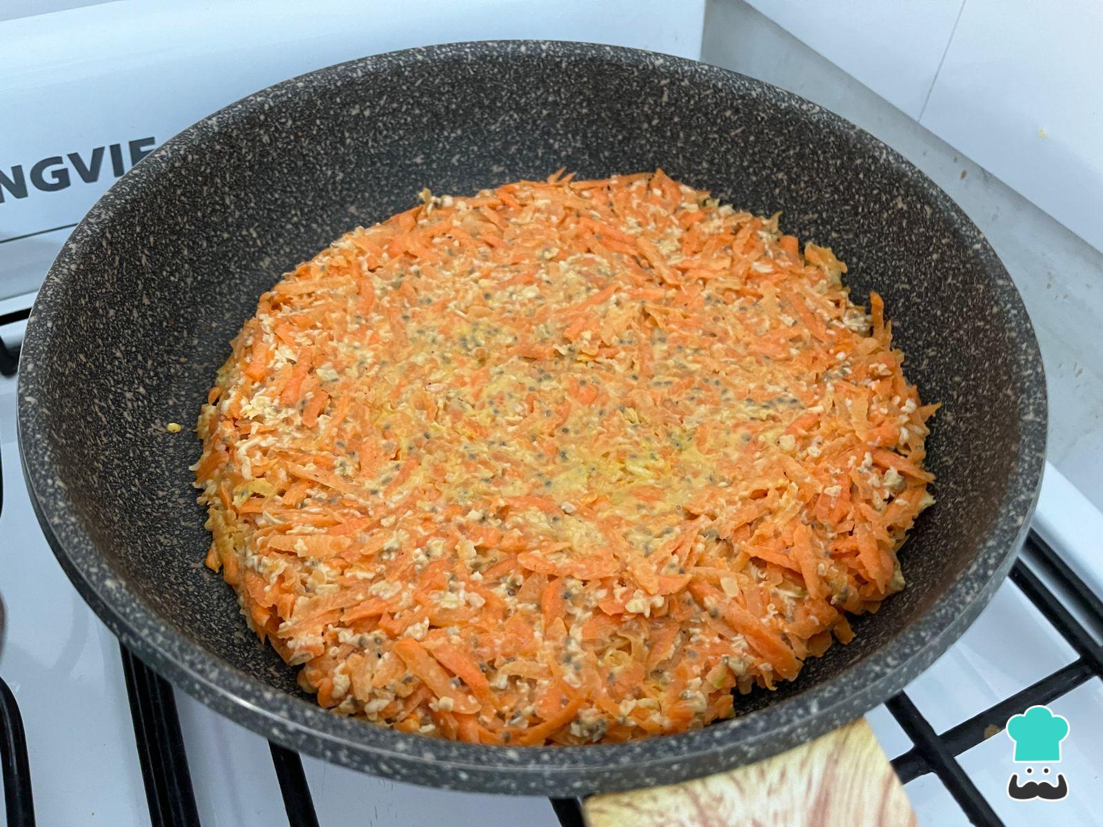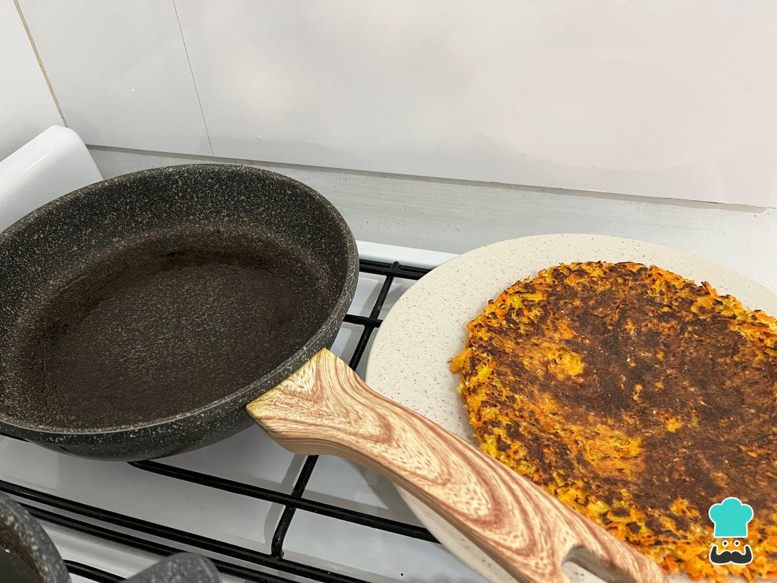 Calienta una sartén antiadherente untada con aceite y, cuando haya alcanzado buena temperatura, baja el fuego al medio y agrega la preparación de zanahoria. Estírala tan fina como puedas para que quede más crocante. Cocina por unos 10 minutos.