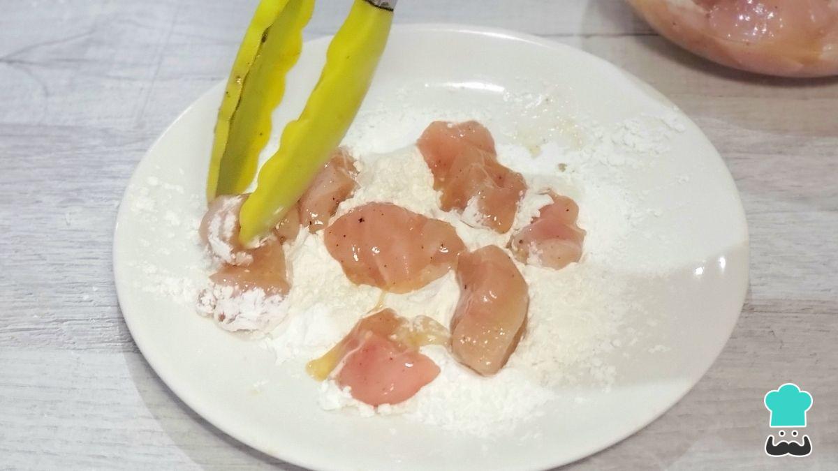 En una bandeja o plato coloca la maicena y pasa los cubos de pollo, escurriendo el exceso de huevo. Empanízalos hasta que queden bien cubiertos.