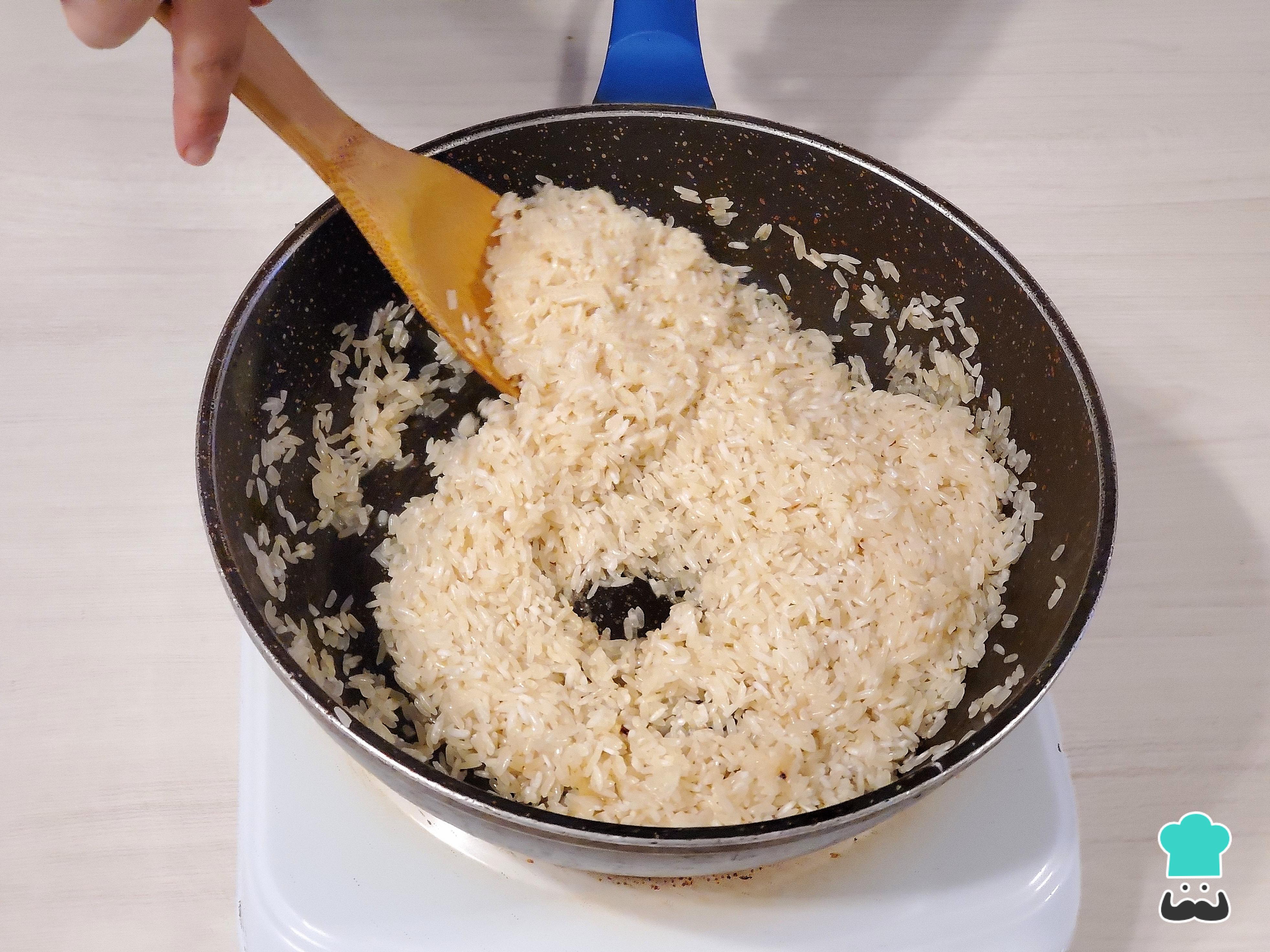 Empieza graneando el arroz. Para hacerlo, primero calienta una olla y vierte un buen chorro de aceite. Con el aceite aún frío, agrega el ajo y remueve hasta que se sofría, pero sin que llegue a quemarse. Ni bien el ajo quiera tomar color, incorpora el arroz que debe estar previamente lavado y remojado.