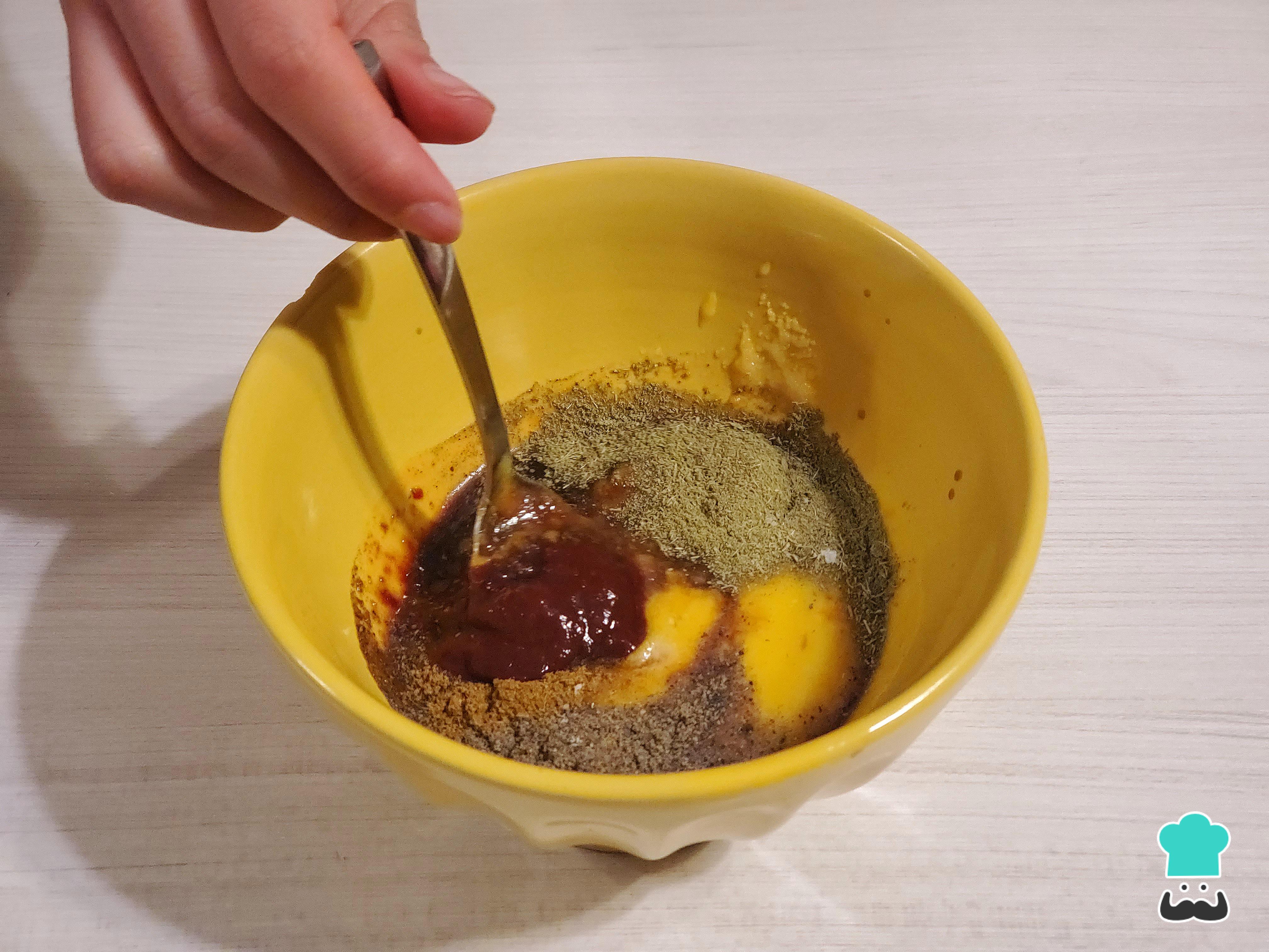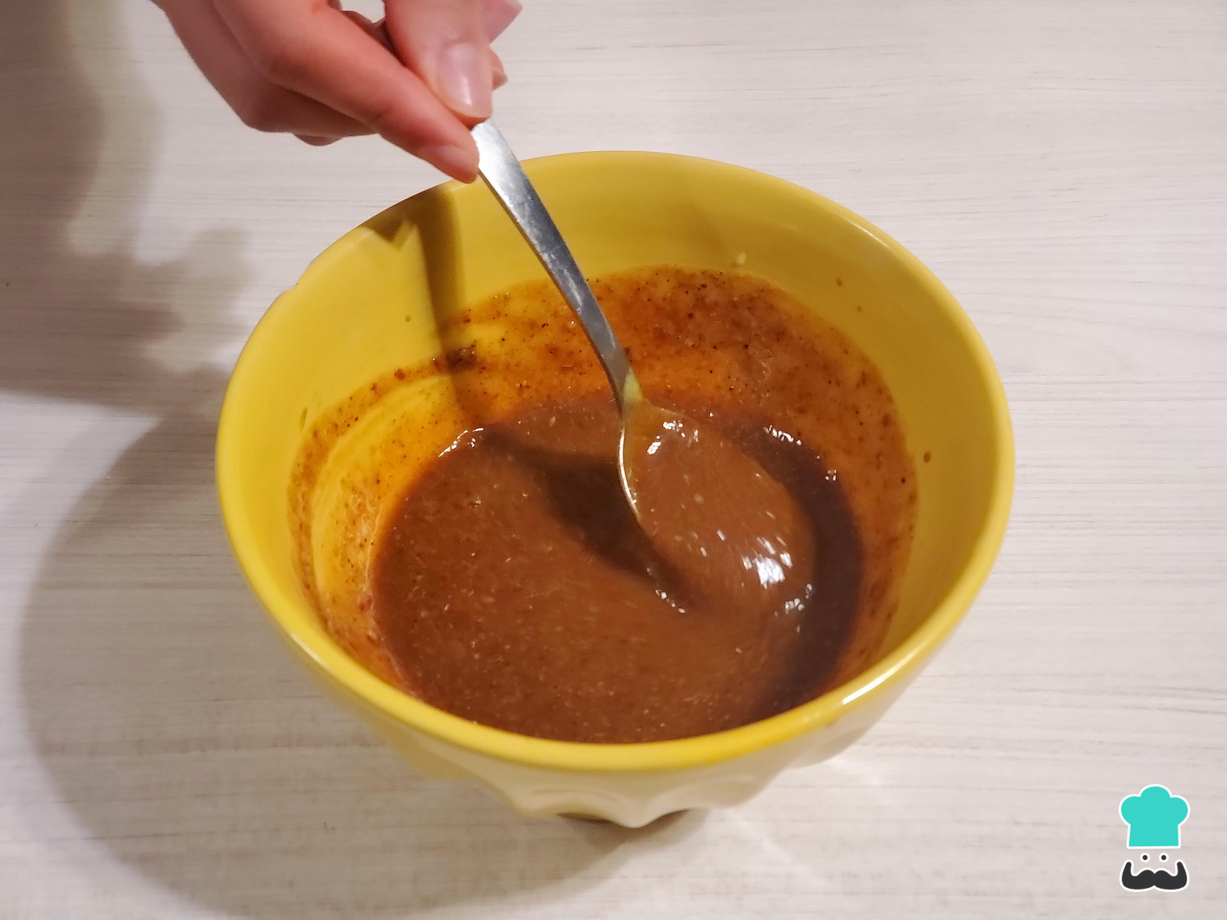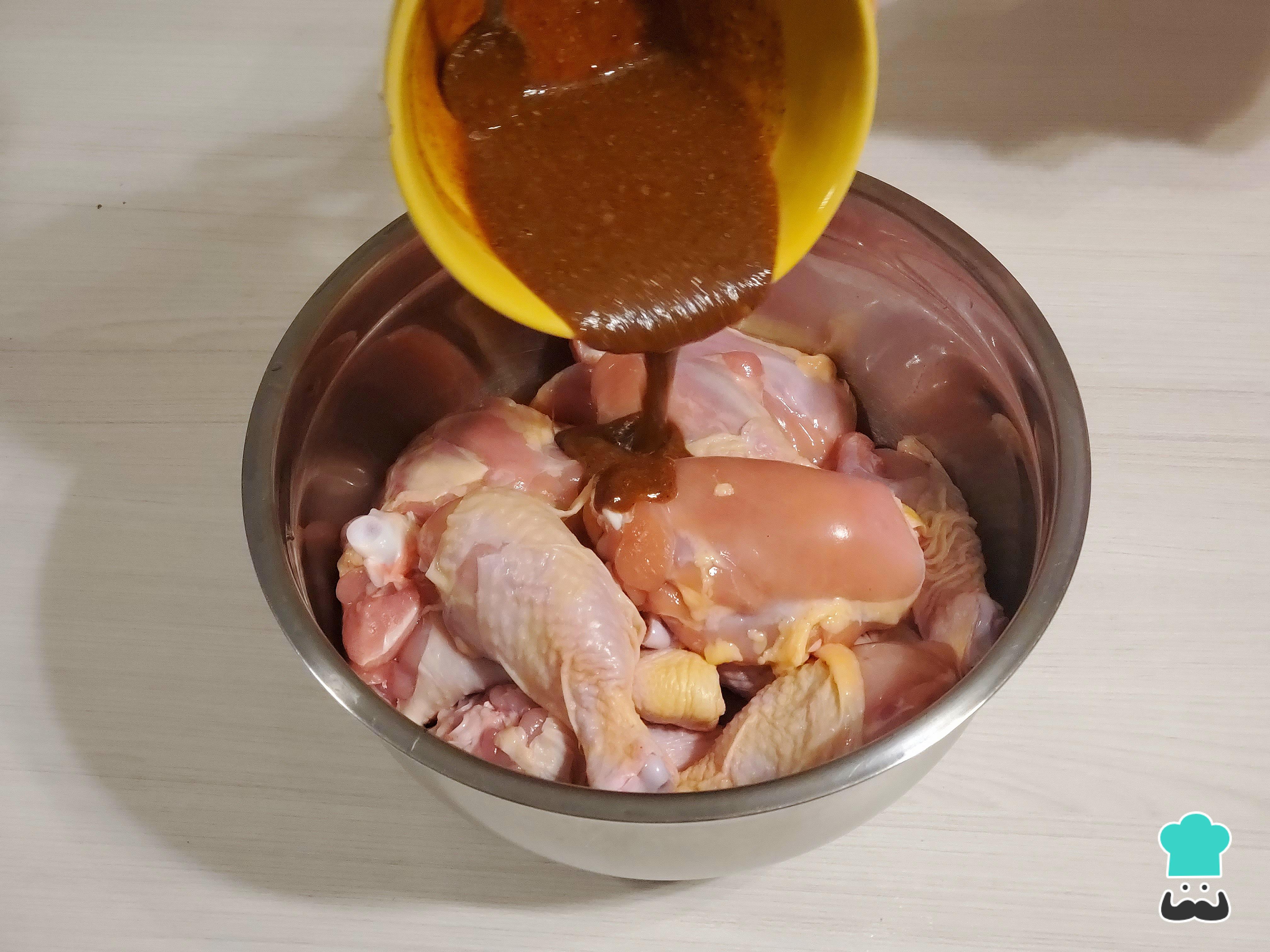 Vierte este aderezo sobre las piezas de pollo untándolas bien con las manos (puedes utilizar guantes). Luego, tapa el recipiente y refrigéralo durante 1 hora para que el sabor penetre en la carne.