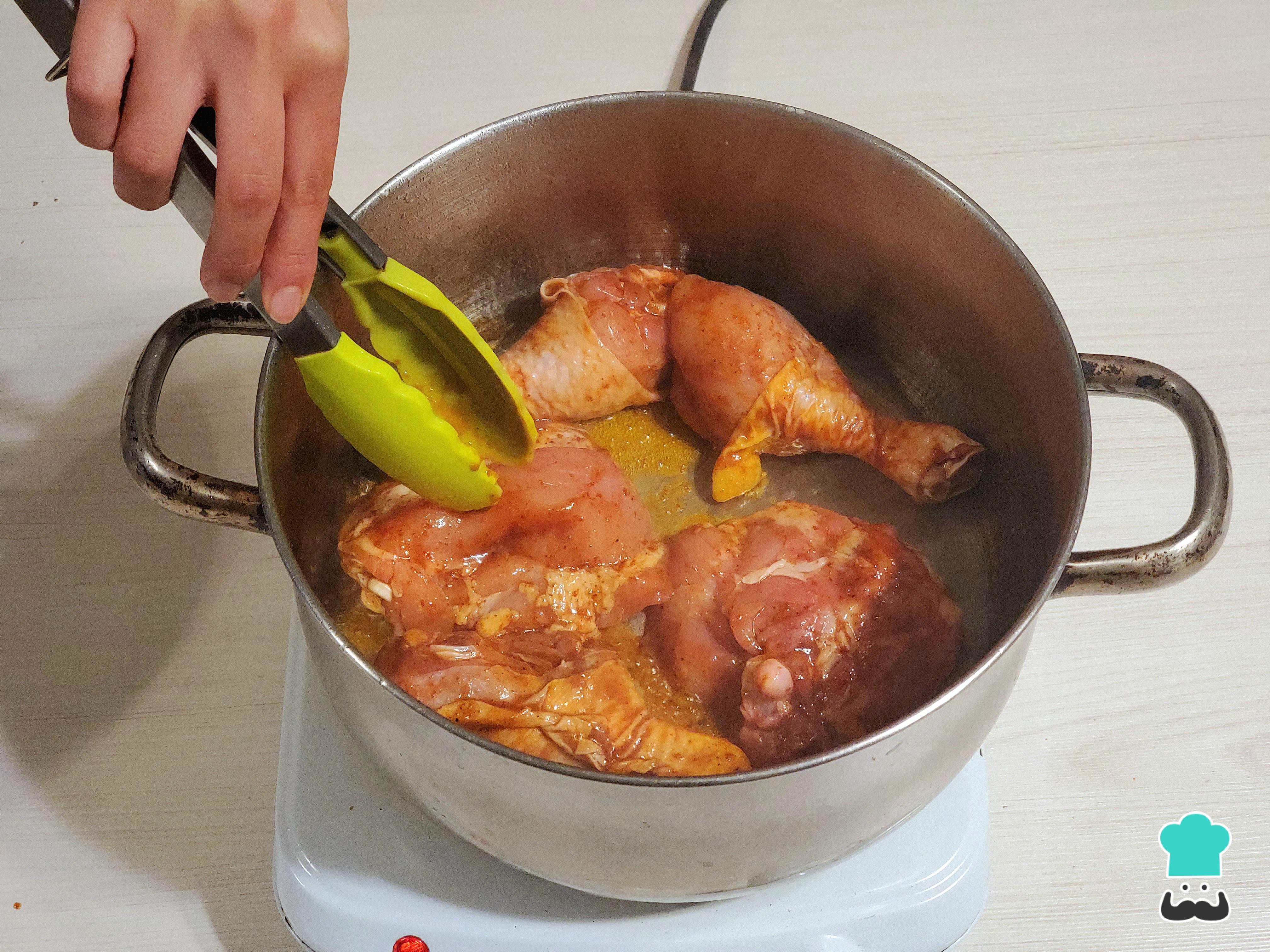 Cumplido el tiempo de reposo, enciende una hornilla a fuego alto y coloca una olla grande. Vierte un chorro de aceite y, cuando este bien caliente, empieza a sellar las presas hasta dorar por todos los lados. Asegúrate de hacerlo por tandas para evitar que la olla se enfríe y los pollos se sancochen en vez de dorar.