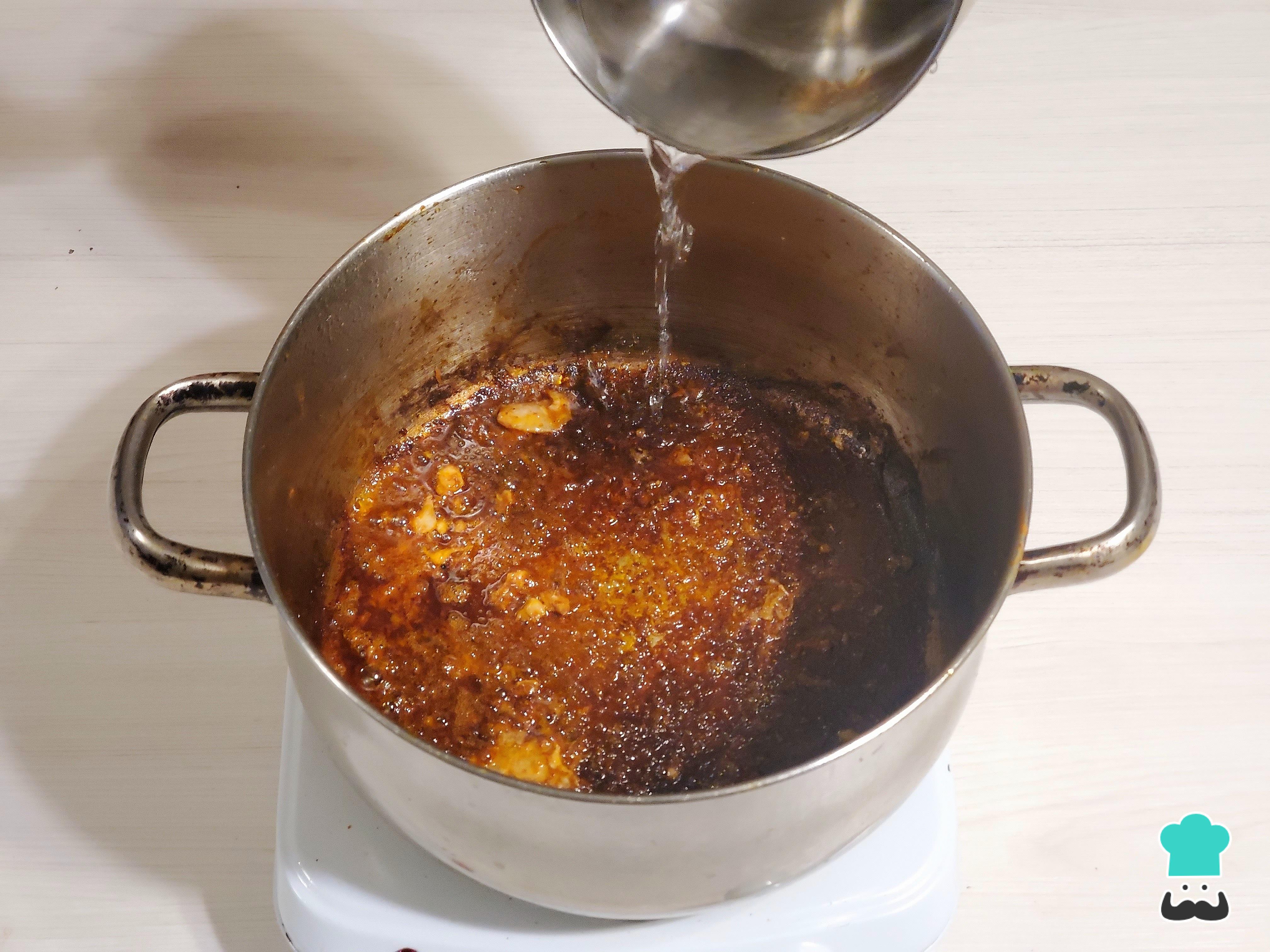 Reserva las piezas de pollo aparte y vierte en la olla un buen chorro de caldo de pollo o agua para poder despegar los restos caramelizados en el fondo. Rasca con un cucharón resistente al calor.