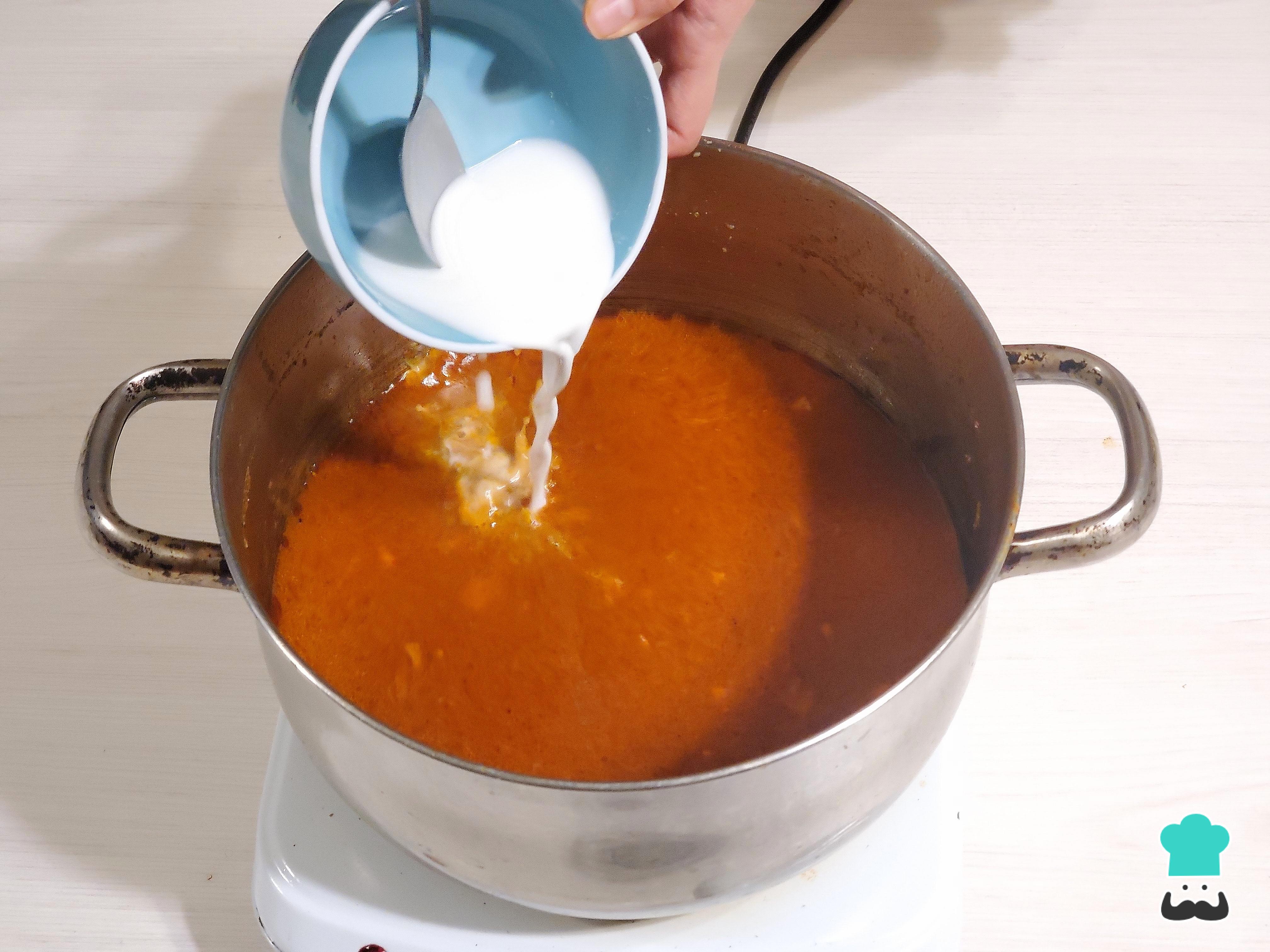 Verifica que las piezas de pollo estén bien cocidas y retíralas de la olla para poder espesar la salsa de cocción. Para hacerlo, coloca la maicena o chuño en un ramequín y disuélvela con agua fría. Mezcla bien hasta que no se vean grumos y viértelo en la olla.