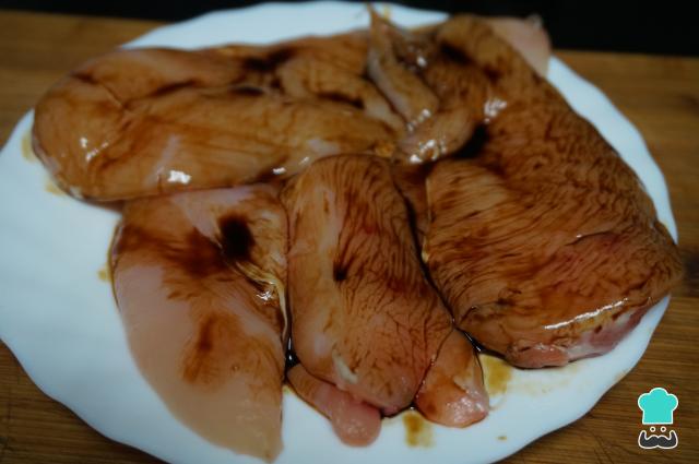 Para empezar esta receta de pollo chino al limón, pondremos los filetes de pollo en una fuente, los dejamos macerando con la salsa de soja y una pizca de sal, lo tapamos. Lo dejamos unos 30 minutos para que coja el sabor en la nevera.