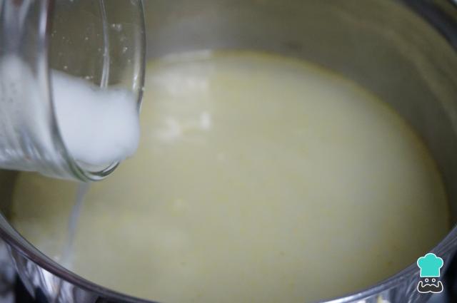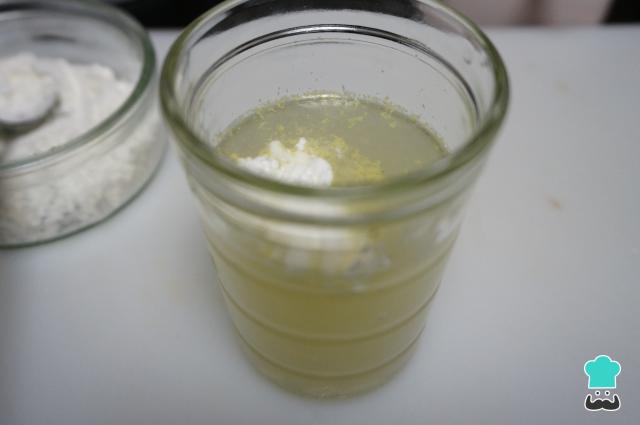 Preparamos la salsa de limón. Exprimimos 2 limones, lo pasamos a un vaso y añadimos 2 cucharadas de maicena al jugo de limón. Lo batimos bien hasta que quede bien diluida la fécula de maíz o maicena.