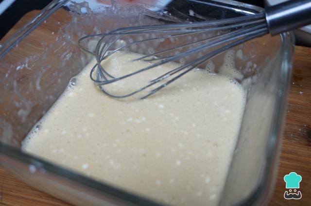 Batimos 2 huevos en un bol, añadimos la harina de maíz, la mezclamos bien con el huevo, podremos 3-4 cucharadas de harina, ha de quedar una masa como una crema ligera.