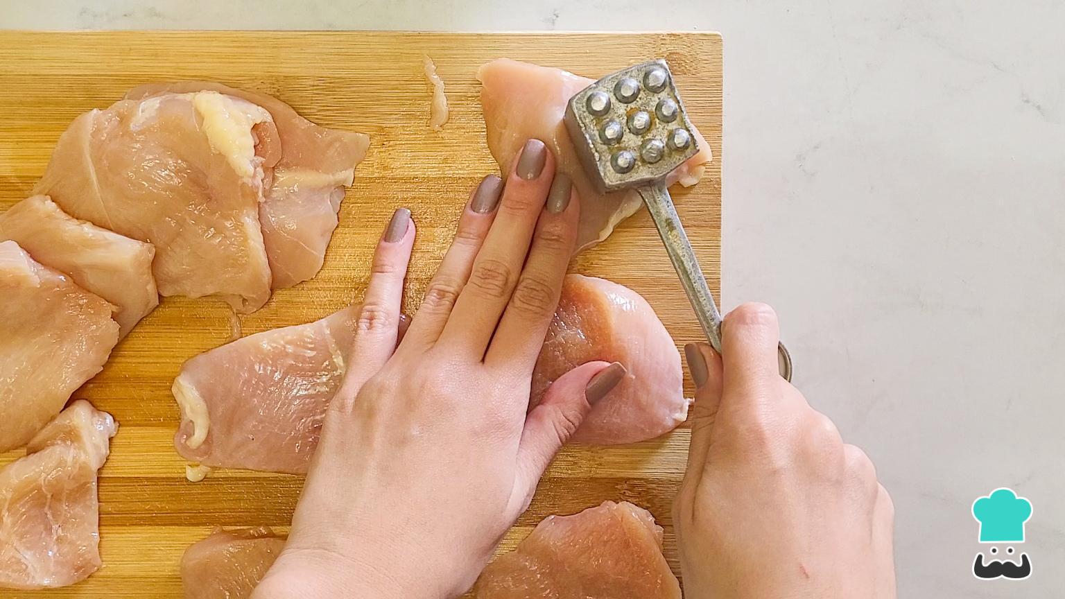 Corta el filete de pechuga de pollo en trozos más pequeños y finos (aproximadamente de 5 a 6 cm). Utiliza un batidor para batir el pollo y ablandar la carne.