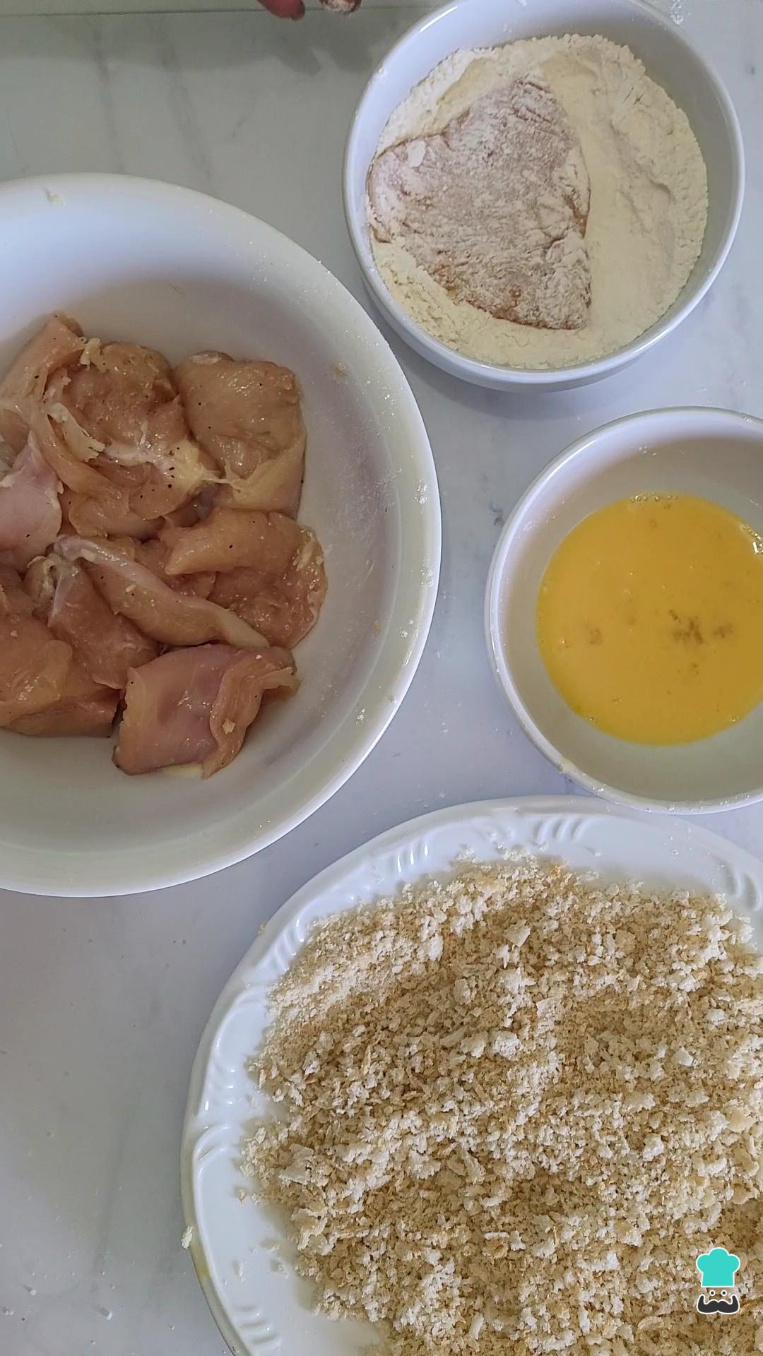 Pasa cada trozo de pollo primero por la harina de trigo, luego por el huevo y termina por la harina de panko.