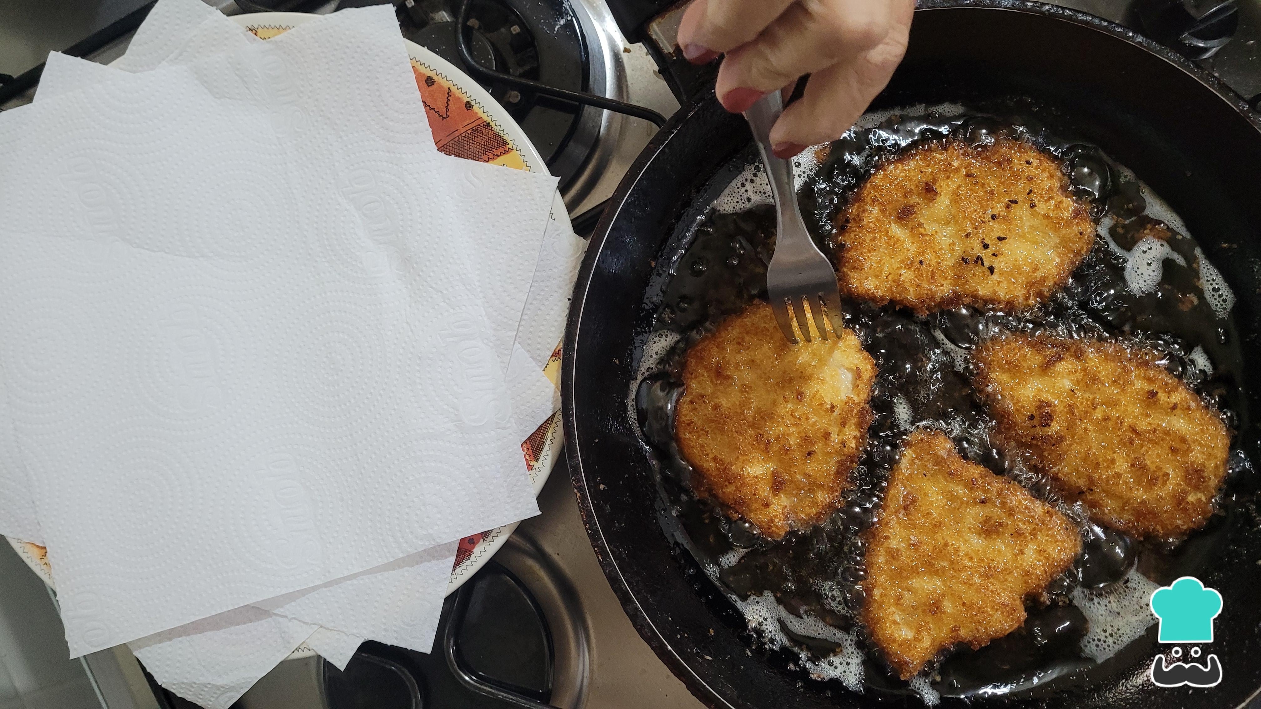 Calienta el aceite en una sartén y, cuando esté caliente, añade con cuidado los trozos de pollo empanizados, uno a uno.