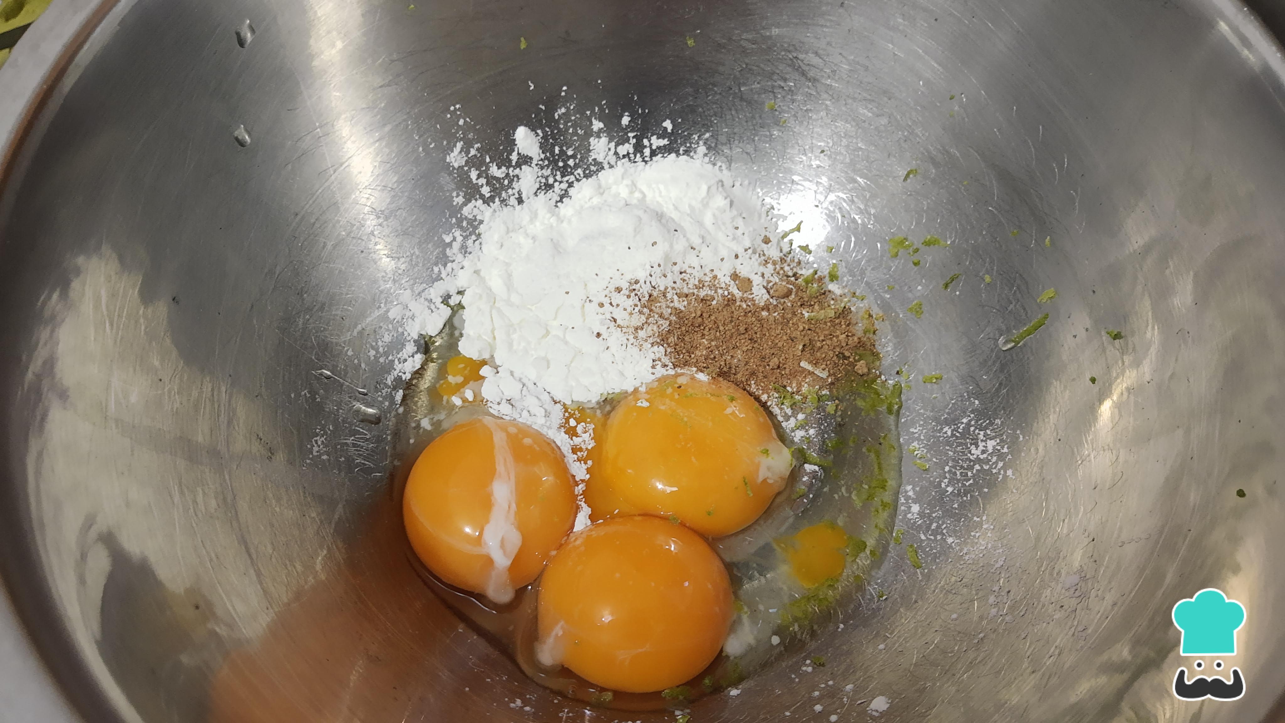 Para hacer la receta de ponche crema venezolano, primero en un recipiente coloca las yemas de huevo, la ralladura de un limón, la maicena y media cucharadita de nuez moscada. Con un batidor globo o con una batidora eléctrica bate por unos 3-5 minutos hasta que las yemas se aclaren un poco y se haya espumado ligeramente. Luego, reserva.