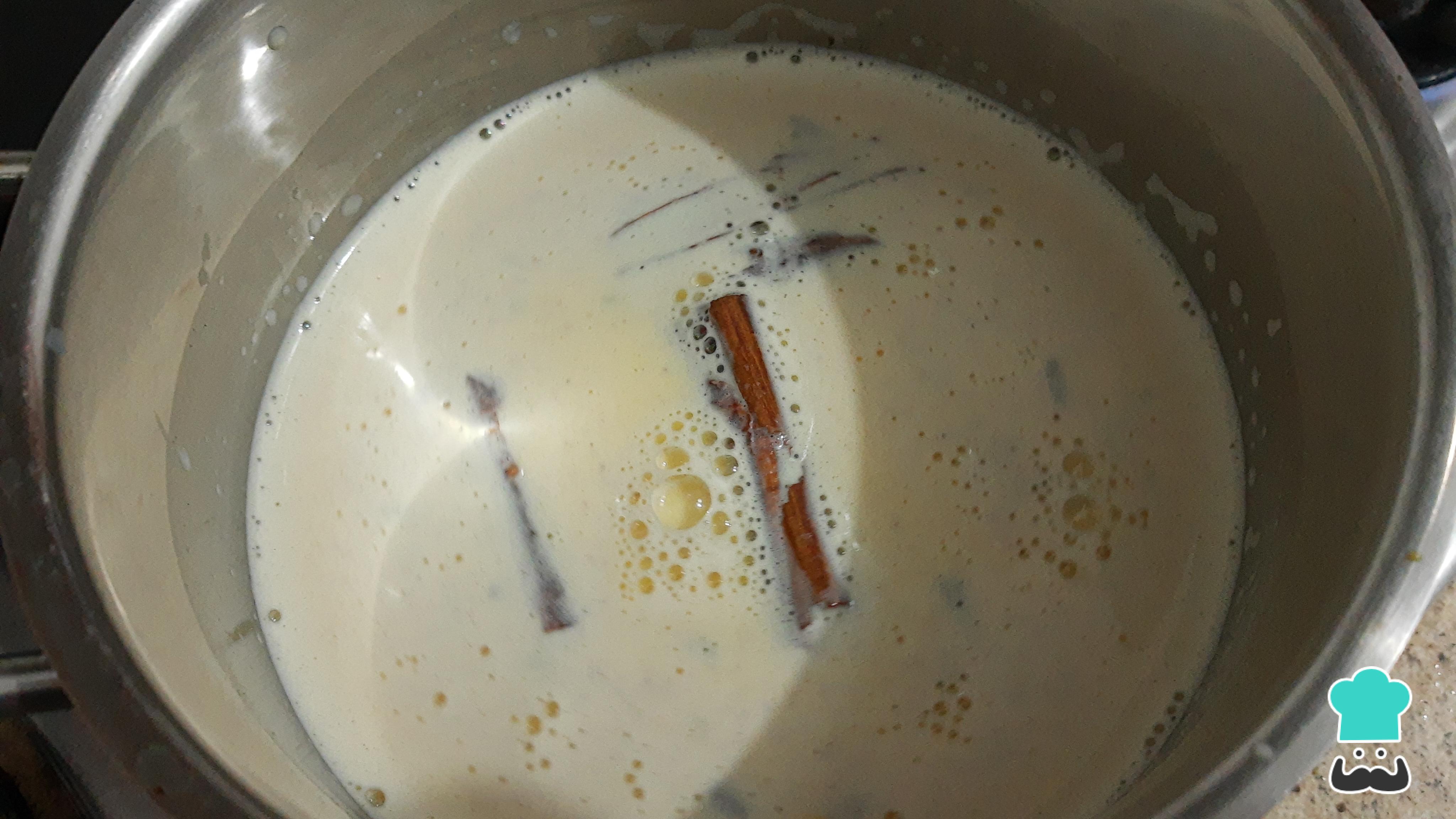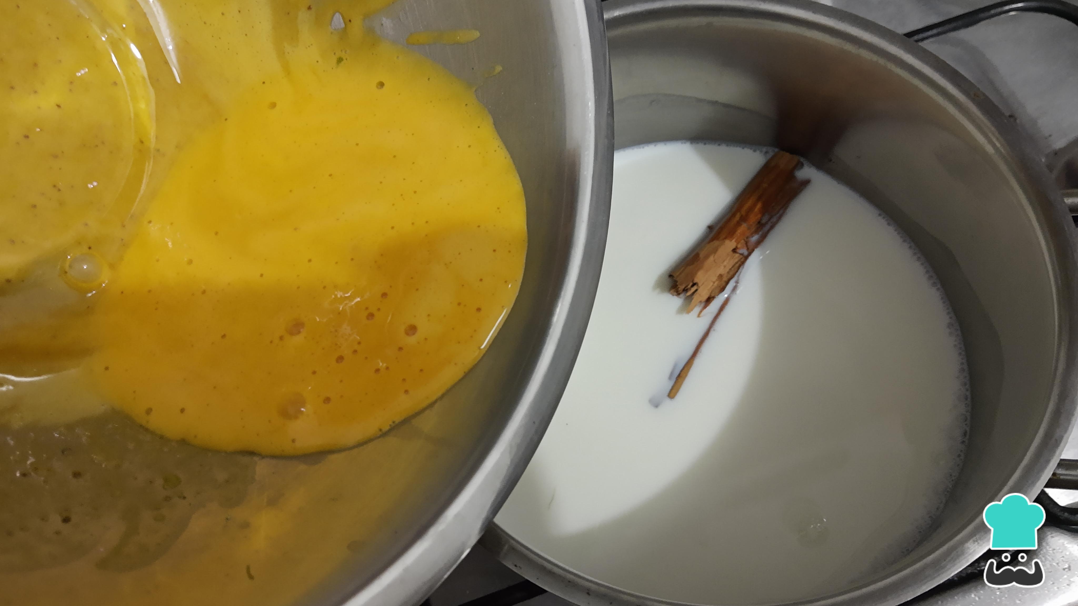 En una olla vierte la leche, agrega la rama de canela, la vainilla y las yemas batidas previamente. Mantén a una temperatura muy baja, solo se va a temperar para que las yemas no se cocinen y se haga grumos.