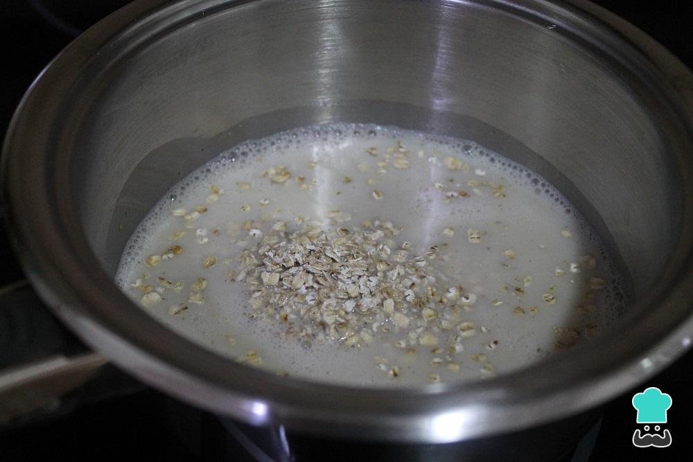 Pon la leche de avena en un cazo al fuego. Agrega los copos de avena y una cucharada de sirope de agave. Remueve de vez en cuando para que no se pegue y déjalo unos 5 minutos. Puedes dejarlo más o menos tiempo dependiendo de si la avena te gusta más espesa o más líquida.