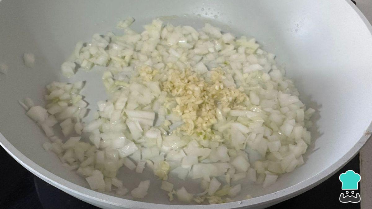 En una sartén añade el aceite de oliva, sofríe primero la cebolla y el ajo, hasta que estén transparentes.