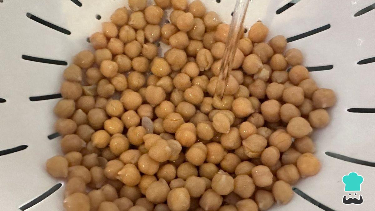 Saca los garbanzos del bote y escúrrelos, pásalos por agua para enjuagarlos bien.