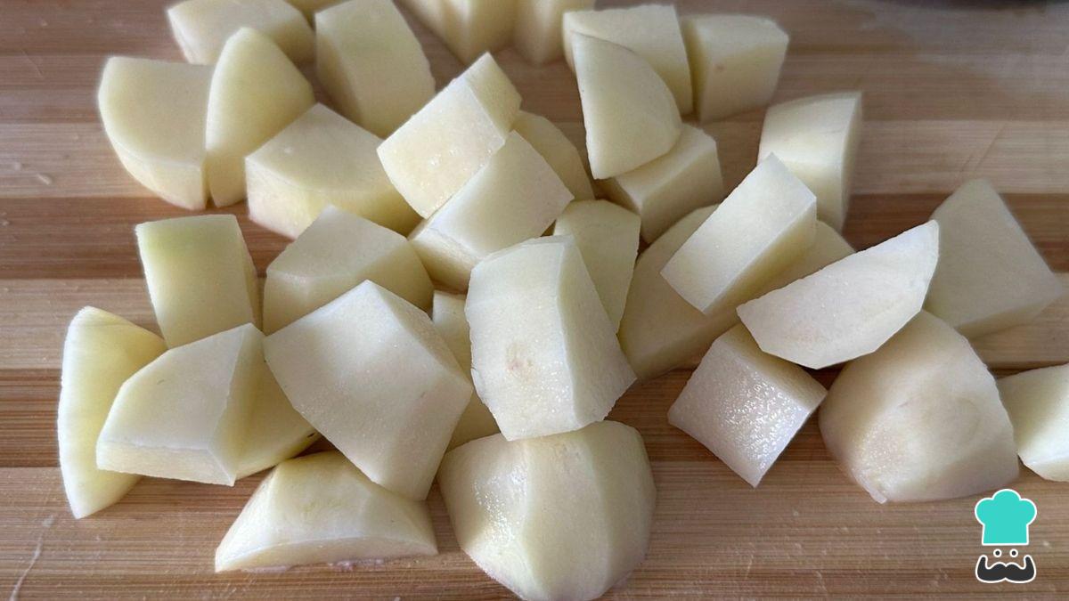 Pela y corta las patatas en cubos, o puedes romperlas en lugar de cortarlas completamente.