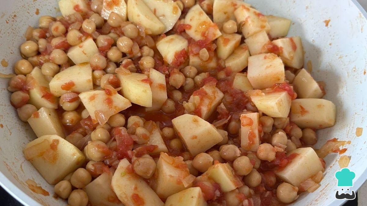 Añade al sofrito los garbanzos cocidos y las patatas, mezcla hasta integrar.