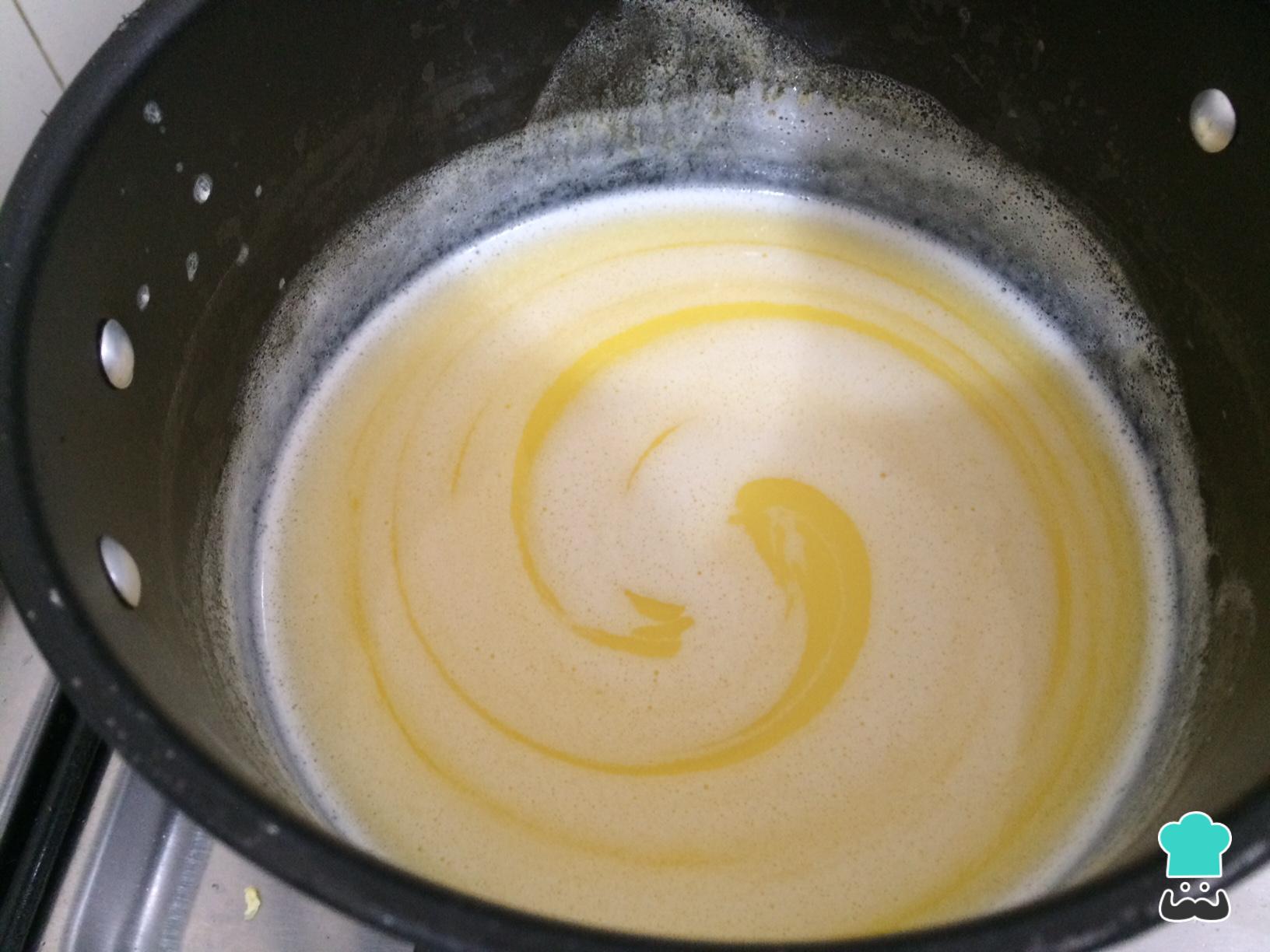 Para realizar la pasta choux, en una olla agregar la leche, el azúcar, la sal y la mantequilla, cocinar a fuego bajo hasta derretirla totalmente.