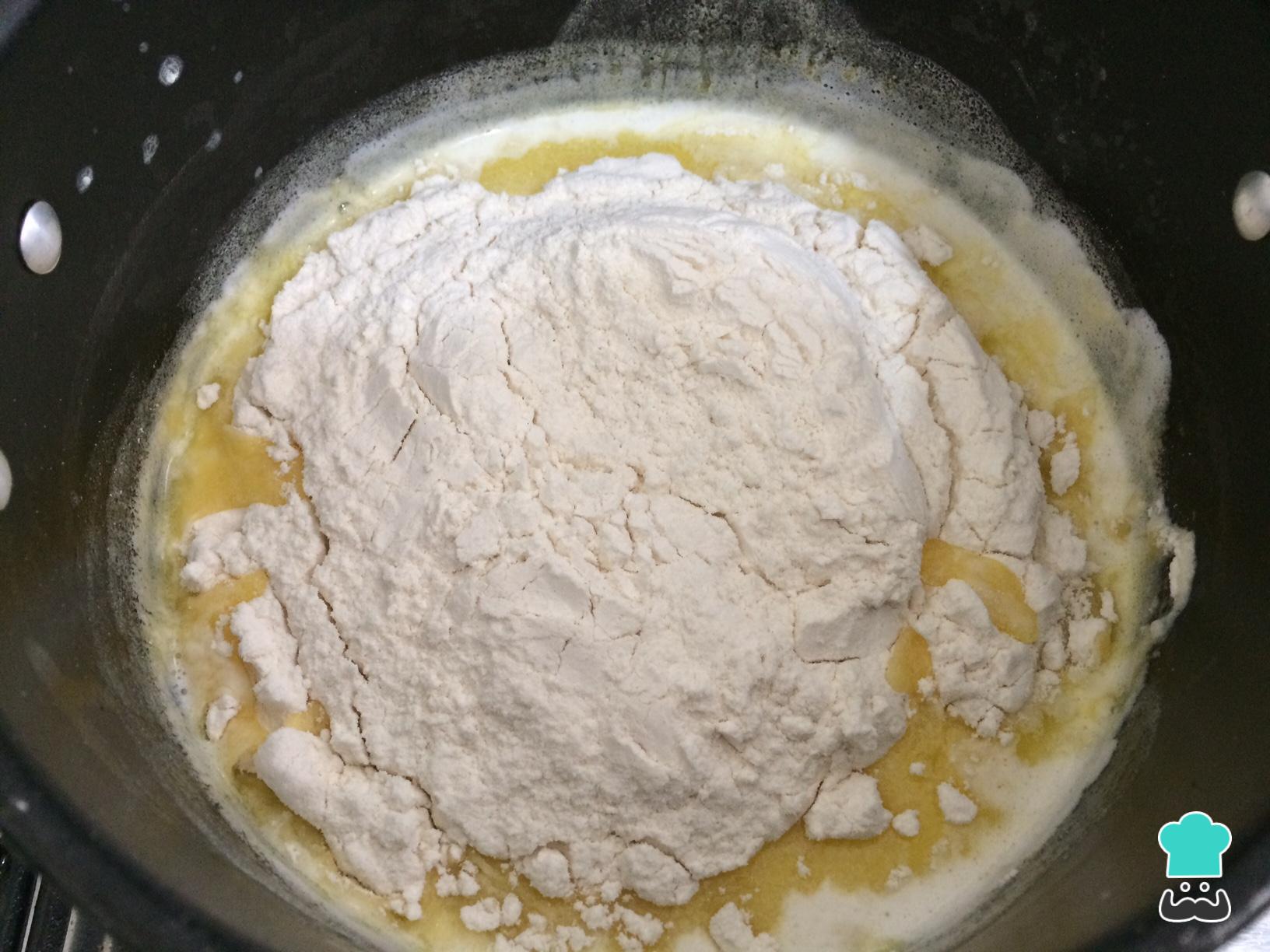Retirar la olla del fuego y agregar la harina de golpe (previamente tamizada), mezclar muy bien hasta incorporar toda la masa. Entonces, volver a llevar la olla a fuego muy bajo y cocinar hasta que se despegue la masa de las paredes de la olla.