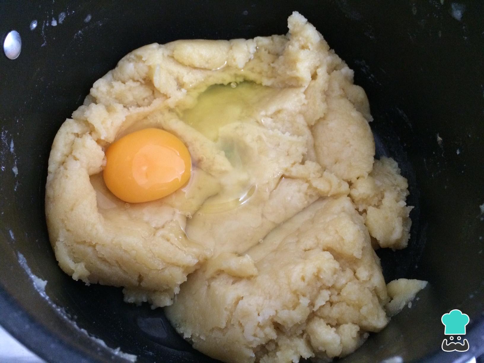 Finalmente apagar el fuego, dejar enfriar la masa y agregar uno por uno los huevos, hasta obtener el punto de cinta.