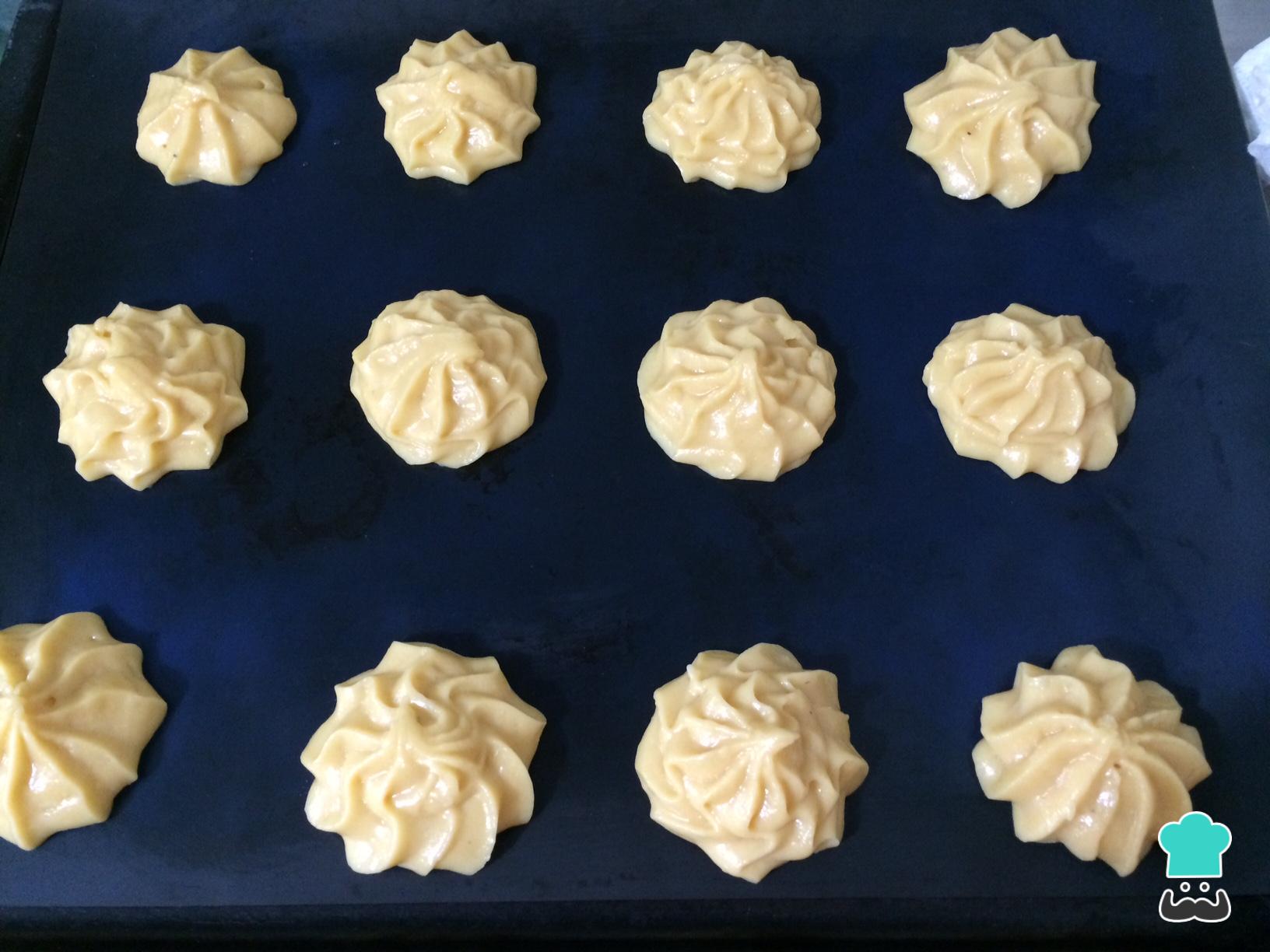 Añadir la pasta chouxa una manga pastelera con una boquilla rizada y en un tapete de silicona, realizar bolitas pequeñas. Cocinar los profiteroles durante 20 minutos a 180°C. cuando salgan del horno dejar enfriar, para poder rellenar los profiteroles.