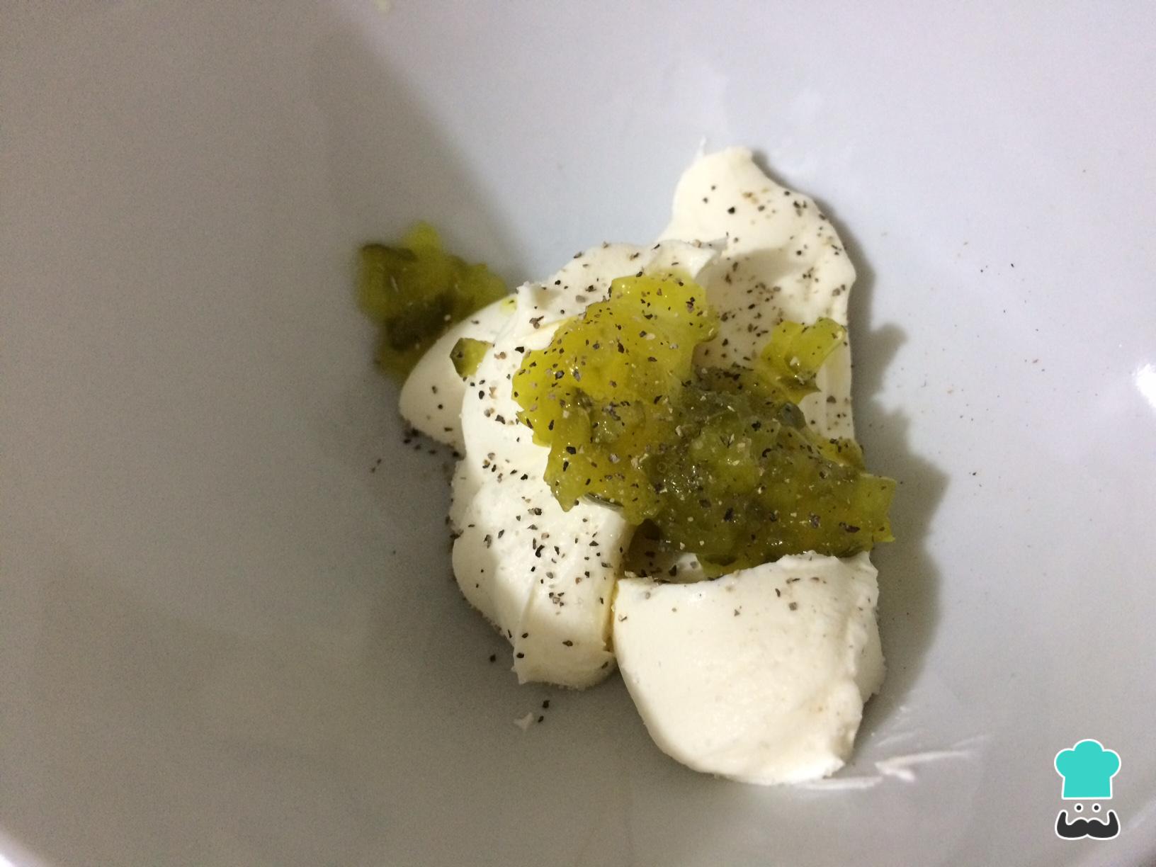 Para realizar el relleno, en un bol agregar el queso crema con la sal, la pimienta y los pepinillos finamente picados, revolver hasta obtener una mezcla suave.
