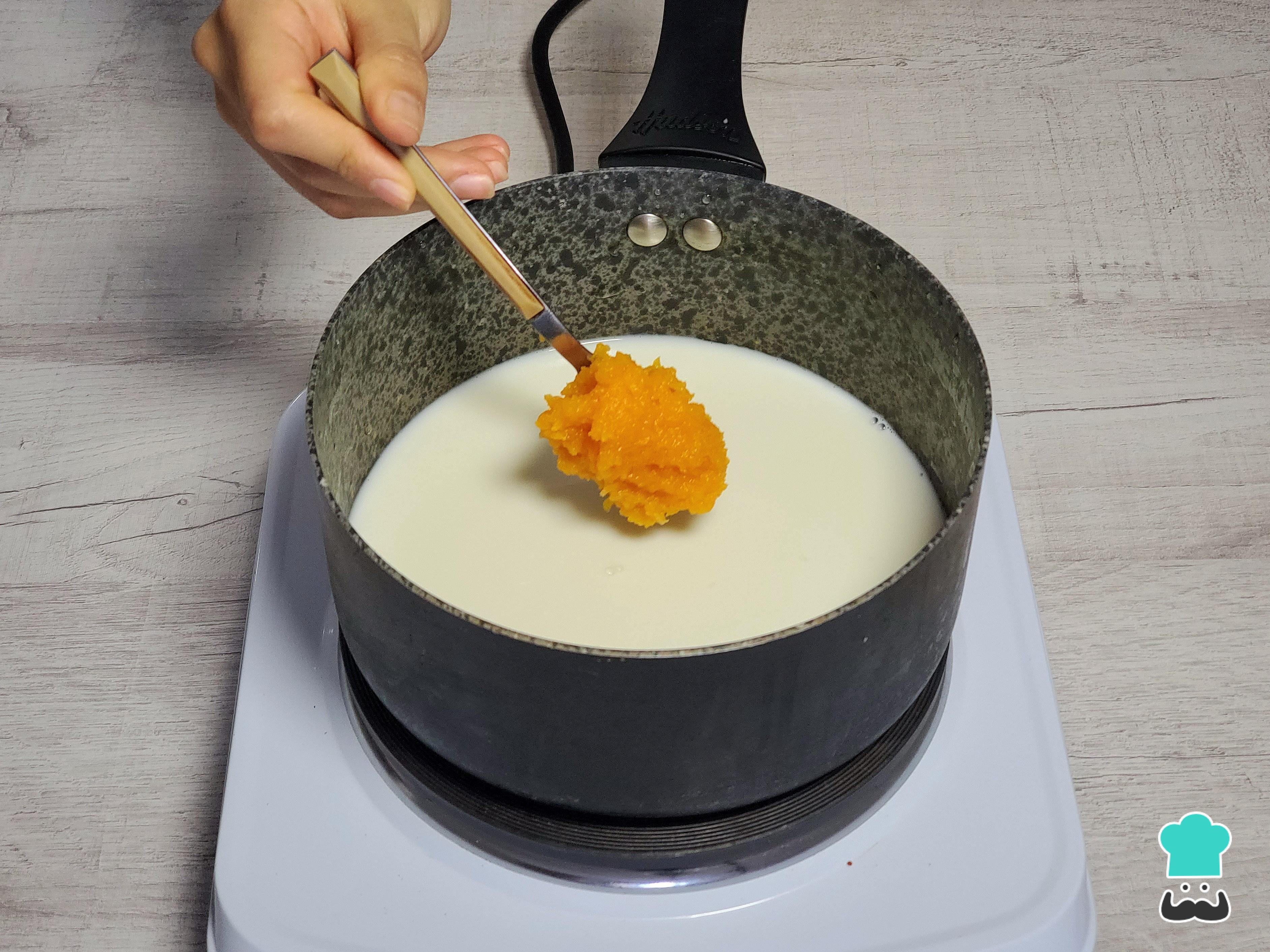 Empieza colocando la leche en una olla o cacerola. Añade el puré de calabaza, la leche condensada (o azúcar, según prefieras) y aromatiza con las especias conocidas como pumpkin spice. Si no tienes acceso a esta mezcla por tu zona, puedes prepararla tranquilamente en casa combinando canela, nuez moscada, clavo de olor, jengibre y pimienta de Jamaica.