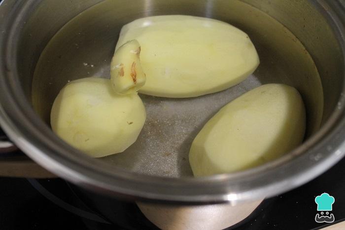 Para preparar nuestro damero de purés de verduras, primero prepararemos el puré de patatas. Para ello, pelamos las patatas y las ponemos en un cazo con agua y un puñado pequeño de sal. Pelamos también el trocito de jengibre y lo cocemos todo hasta que las patatas estén blandas (unos 20 minutos).