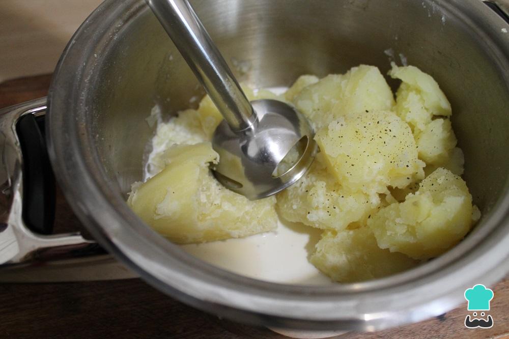 Cuando las patatas estén cocidas, las escurrimos para que suelten todo el agua y le añadimos la nata, la mantequilla, la sal y pimienta (sin el trozo de jengibre). Trituramos todo con la batidora y probamos de sal por si necesita más.