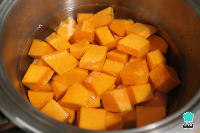 Para continuar con la receta de purés de verduras en forma de tablero, prepararemos también el puré de calabaza. Para ello, troceamos la calabaza y la ponemos en un cazo, cubierto con un poco de agua y sal. Cocemos hasta que esté la calabaza blanda (sobre 15 minutos).