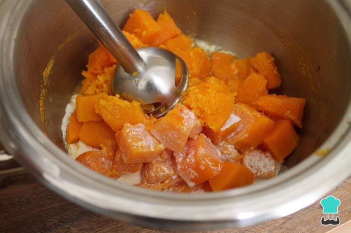 Escurrimos la calabaza, añadimos la nata o crema de leche y la ralladura y el zumo de la naranja. Trituramos todo con la batidora, probamos de sal y rectificamos si es necesario. En este momento, el puré ya está listo para consumir si se desea solo.