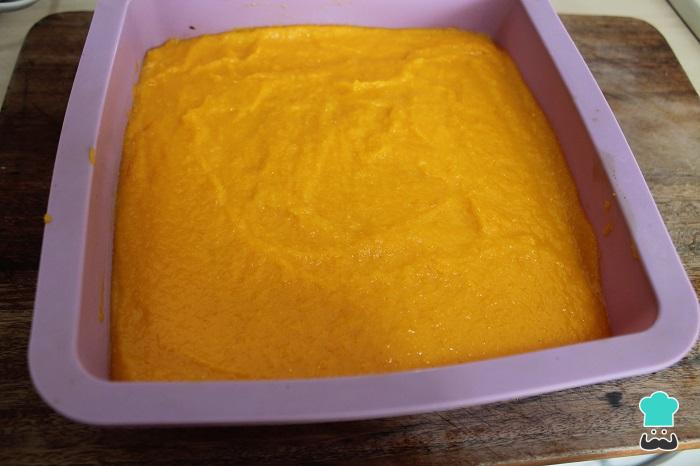 Vertemos el puré de calabaza en un molde cuadrado de unos 17x17 cm aproximadamente y congelamos entre 4-6 horas.