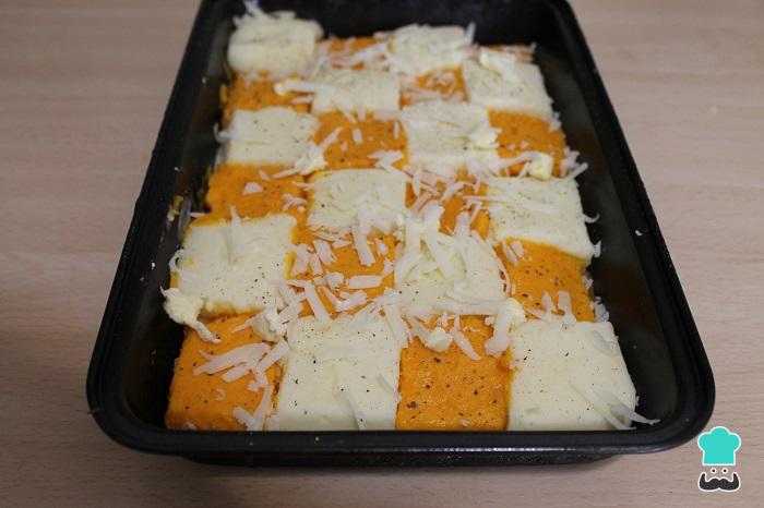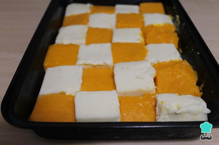 Sacamos los purés del congelador y los cortamos formando cuadrados con ambas elaboraciones, tal y como se muestra en la imagen. De esta manera, el puré de patata y calabaza podrá tomar forma de tablero.