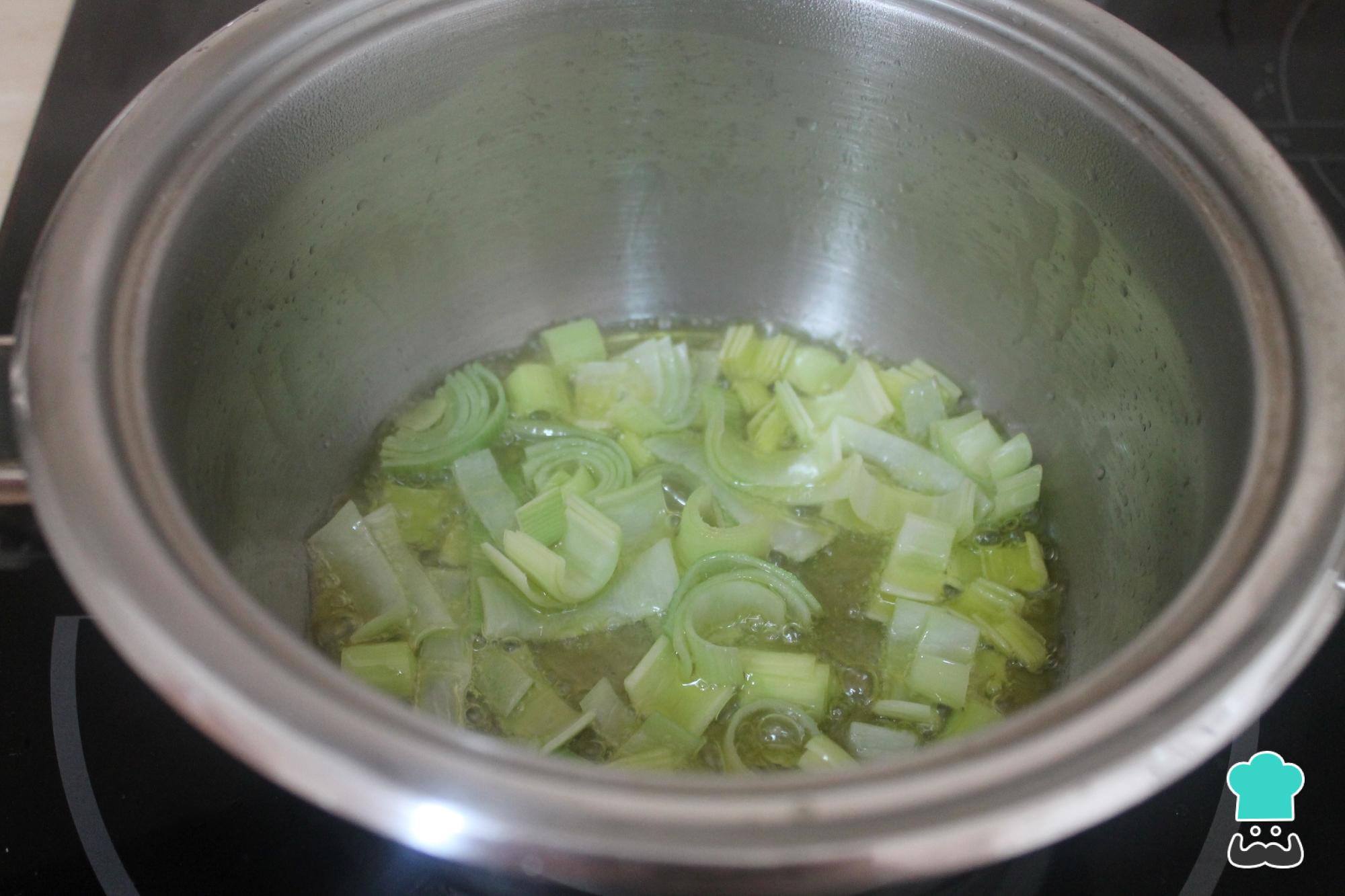 Cuando tengas preparadas las verduras, añade un chorrito de aceite de oliva en una olla. Pon al fuego y, cuando esté caliente, incorpora el puerro para sofreírlo durante unos 2 minutos con un poco de sal removiendo de vez en cuando.
