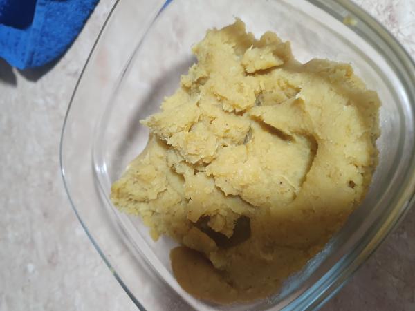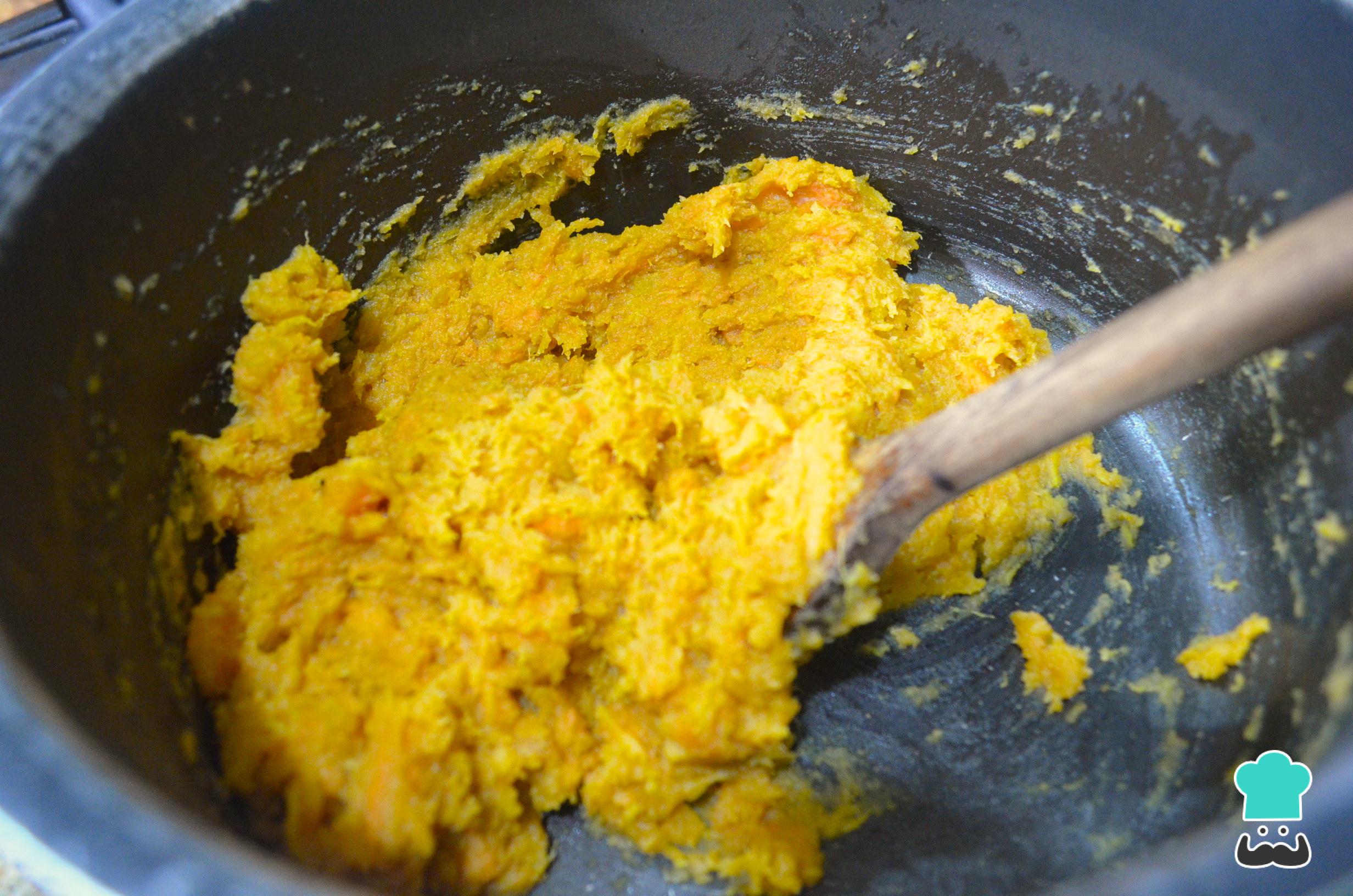 Coloca el puré en una cacerola junto con la mantequilla y el azúcar moreno. Puedes agregar más mantequilla si lo prefieres así como sustituir la mantequilla por aceite de coco para hacer de ésta una receta para veganos y vegetarianos.