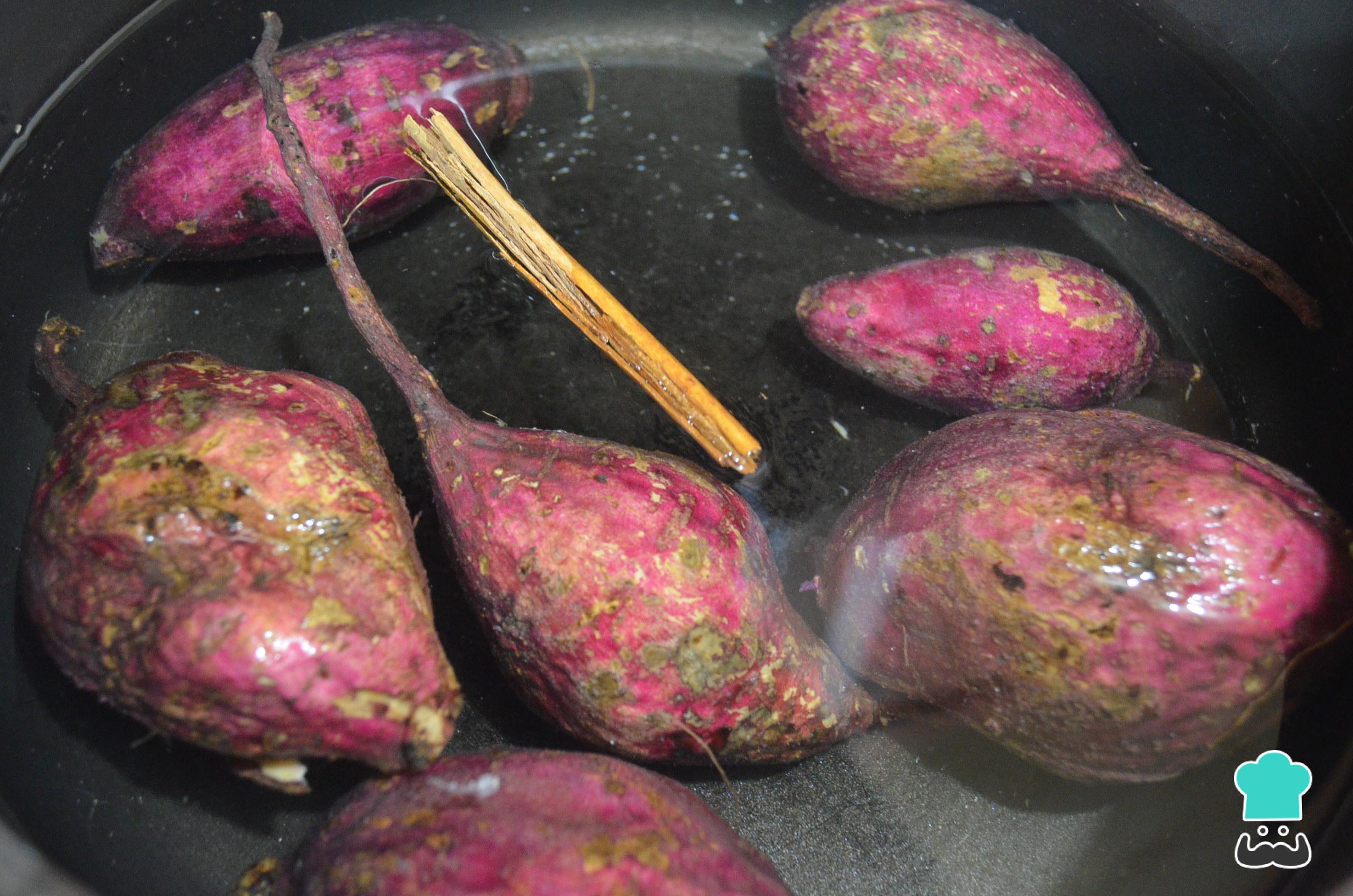 El primer paso para preparar nuestro puré de camote será lavar bien los camotes y ponerlos a cocinar en agua fría que los cubra con una cucharadita de azúcar, el clavo de olor y la ramita de canela. Una vez que rompan el hervor, los camotes tardarán de 15-20 minutos en cocerse, dependiendo del tamaño de éstos. Cuando podamos picarlos fácilmente con un tenedor y estén suaves en el centro es que están listos.