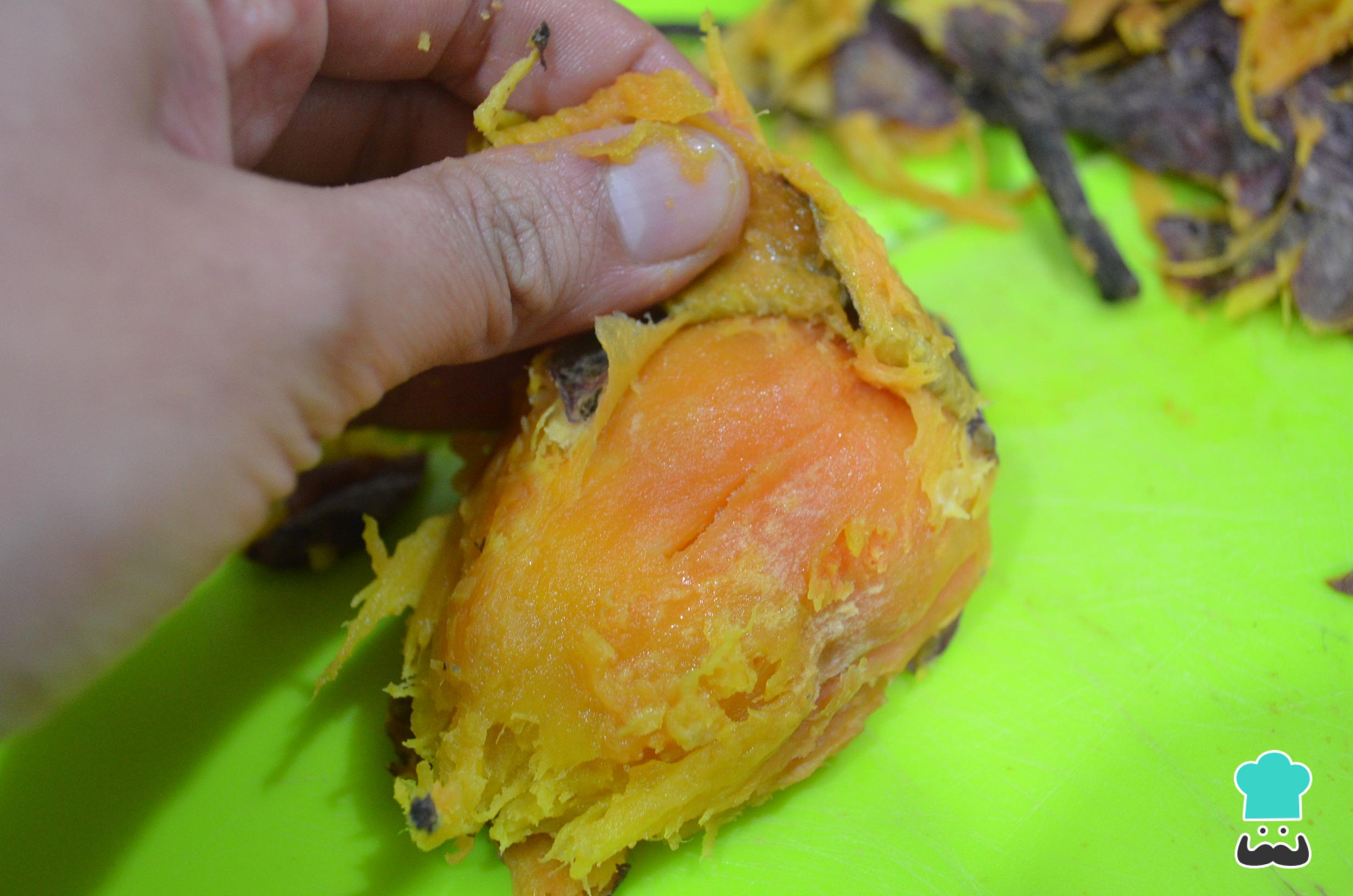 Una vez que estén cocidos, retirar del fuego, dejar enfriar por un momento y pelar los camotes. Puedes ayudarte con una cuchara para desprender la piel más fácilmente.