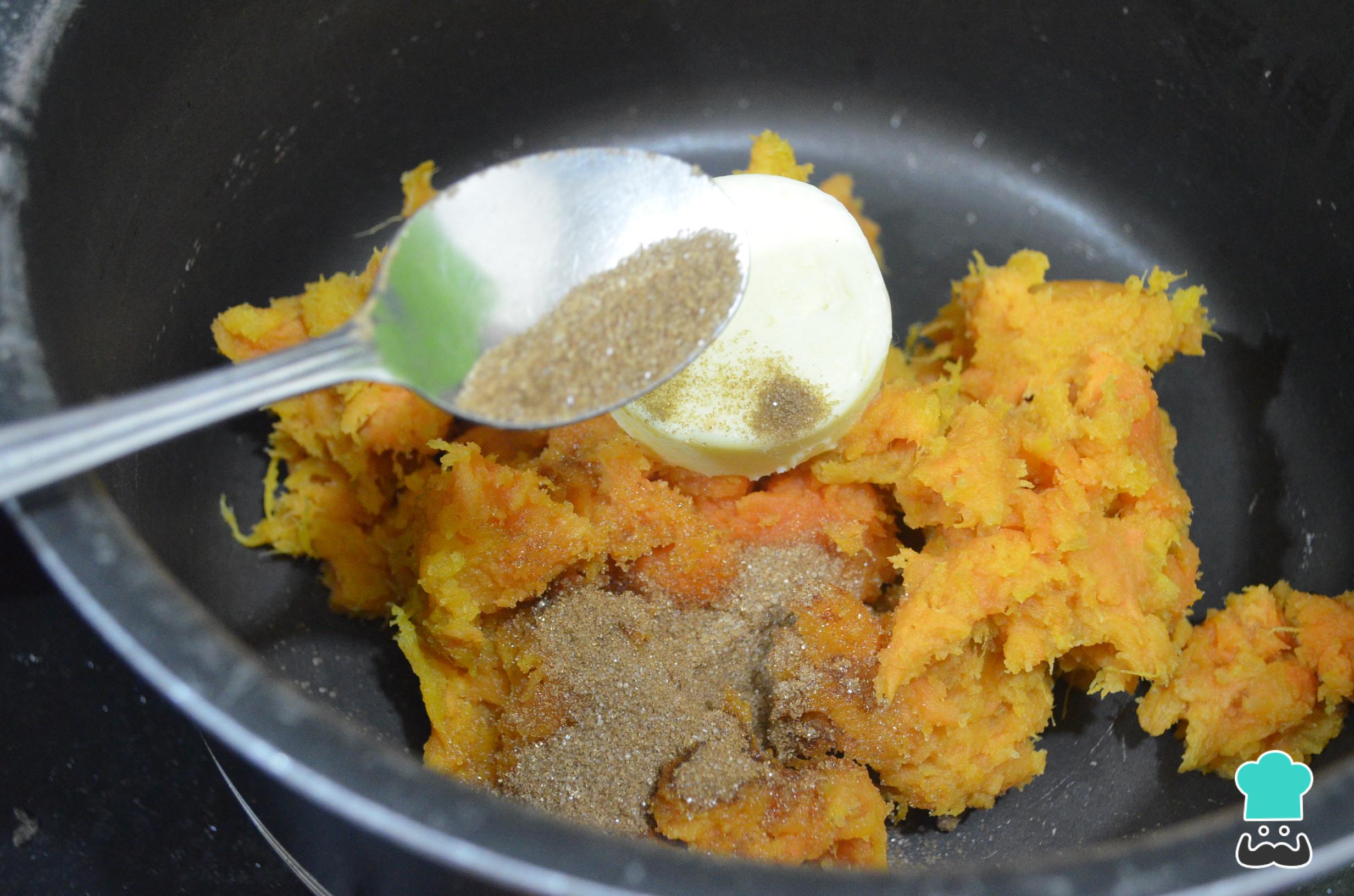 Cocina el puré de camote a fuego lento, moviendo constantemente, hasta que empiece a espesar. Por último agrega una pizca de sal y la nuez moscada. Revuelve bien hasta que todos los ingredientes estén bien integrados.