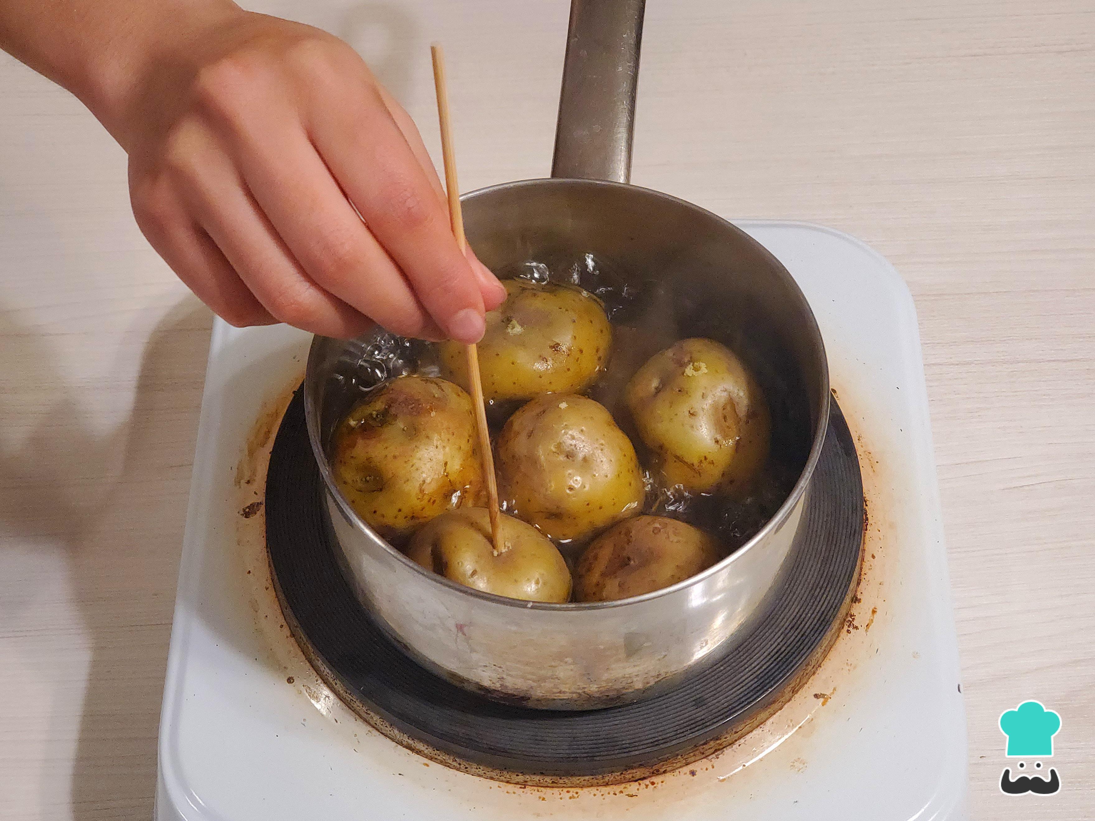 Empieza preparando el puré de papas. Primero, lava las papas amarillas y colócalas en una olla. Llénala con agua fría, agrega un puñado de sal y coloca la olla en una hornilla a fuego lento. Deja que se cocinen durante aproximadamente 20 minutos o pínchalas para saber si están listas.