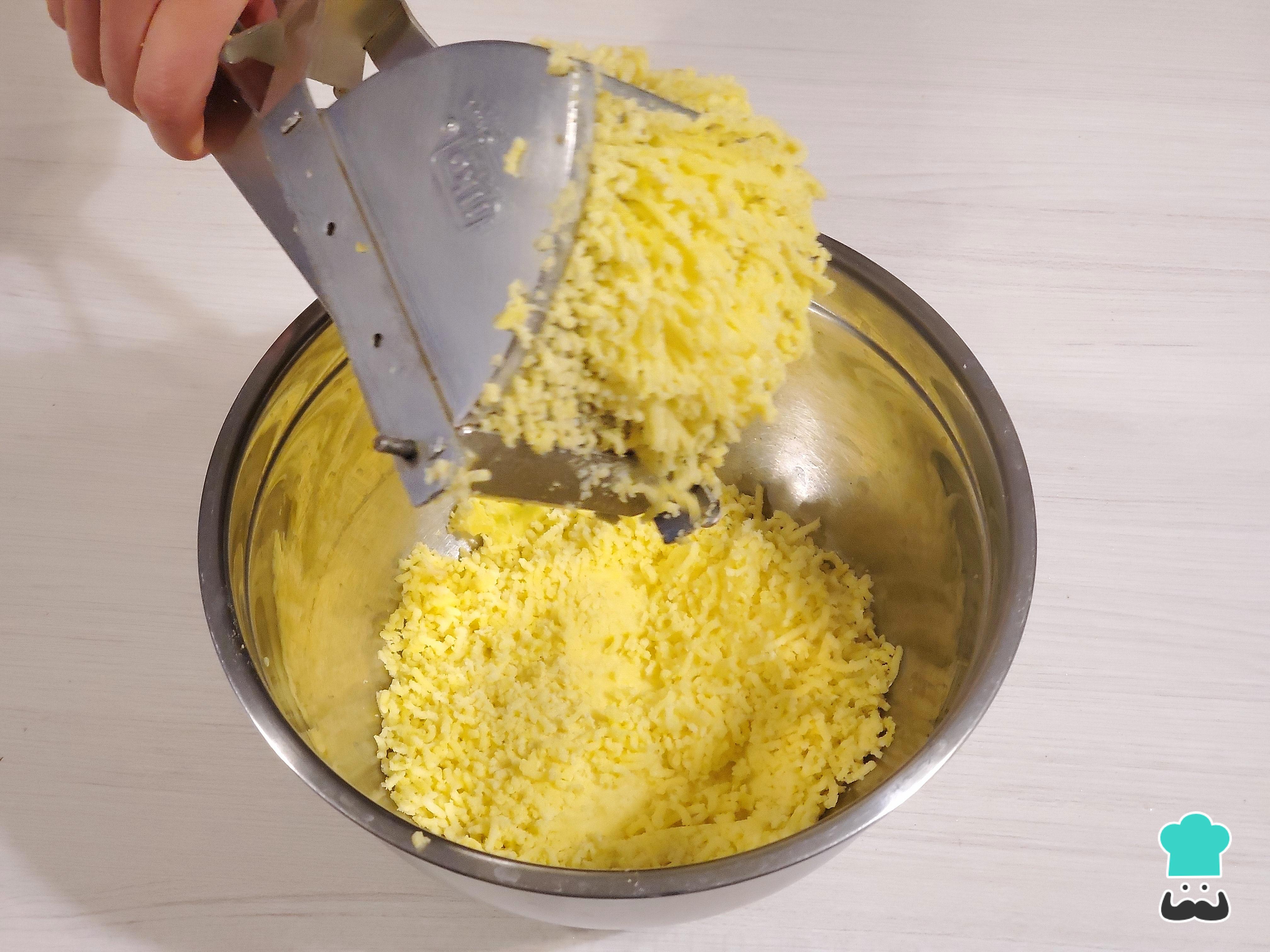 Inmediatamente después, pélalas y pásalas por un prensador mientras aún están calientes.