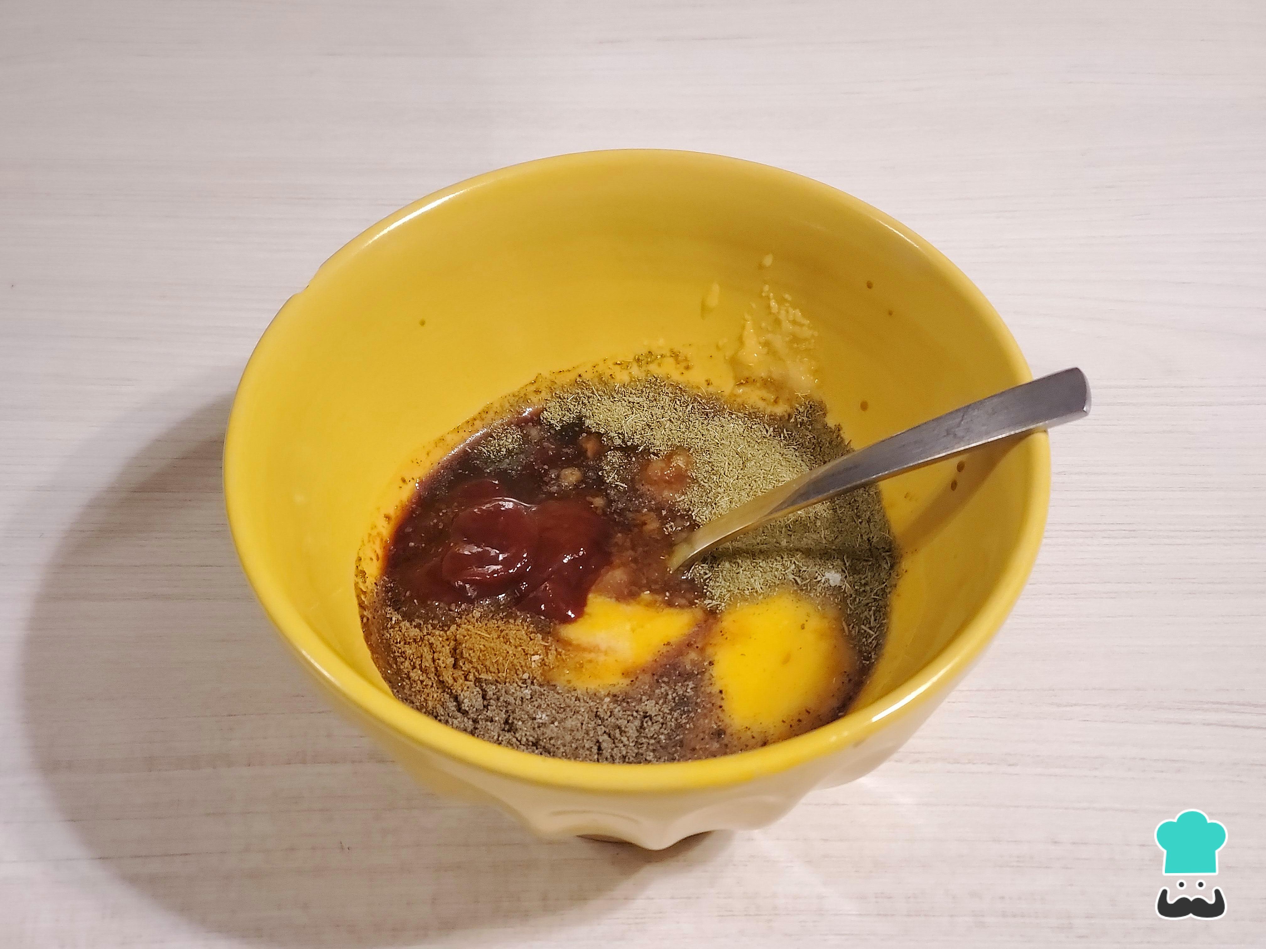 Para preparar el pollo a la olla, vierte en un bowl pequeño los ajíes, especias y hierbas: ají panka, ajo molido, mostaza, sillao, vinagre, comino molido, pimienta negra molida, orégano seco molido y media cucharadita de sal.