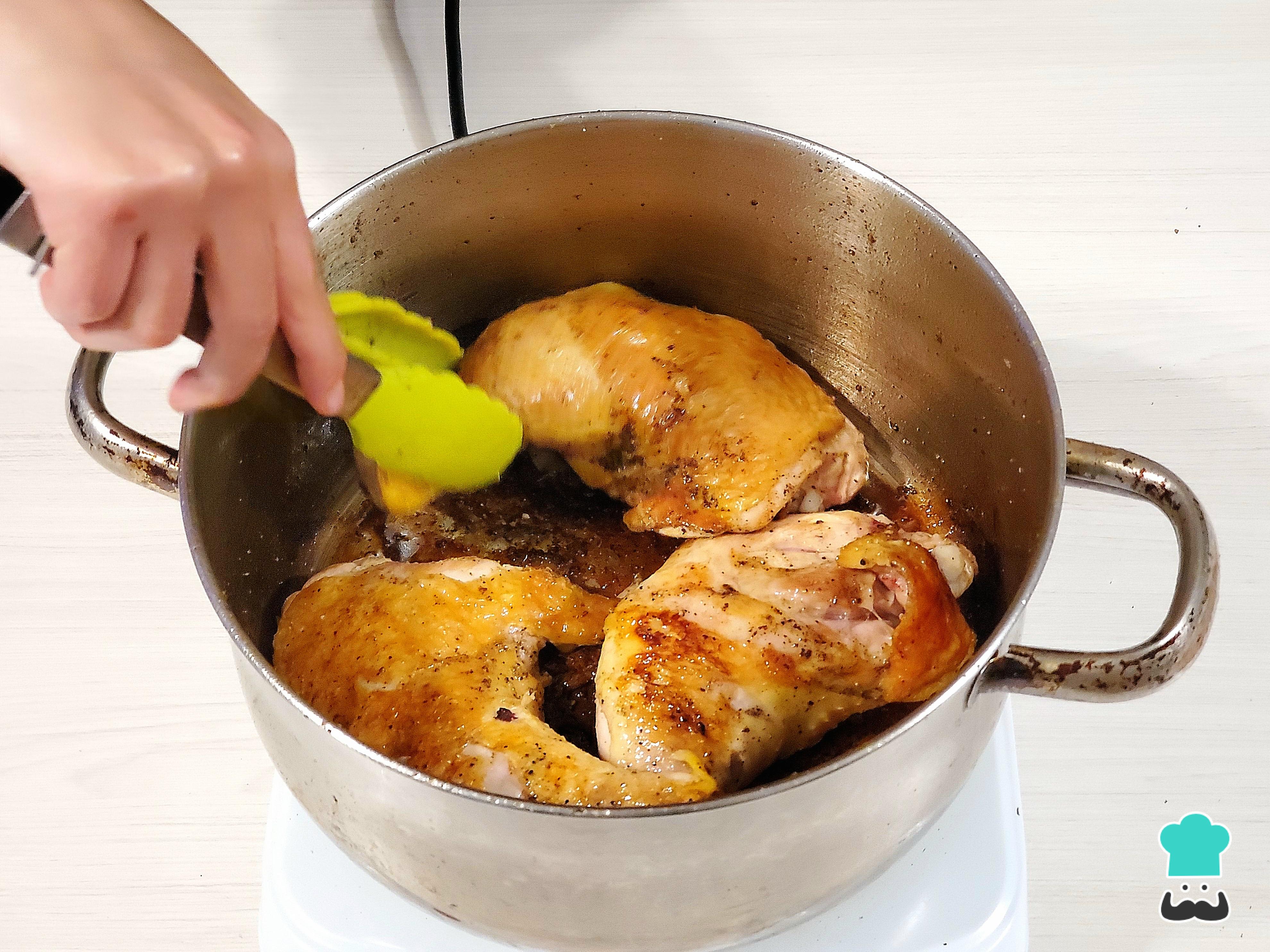 Reserva las piezas de pollo aparte y rescata los sabores pegados al fondo de la olla. Para hacerlo, simplemente vierte agua y, después de un par de minutos cuando rompa hervor, raspa con una cuchara resistente al calor.