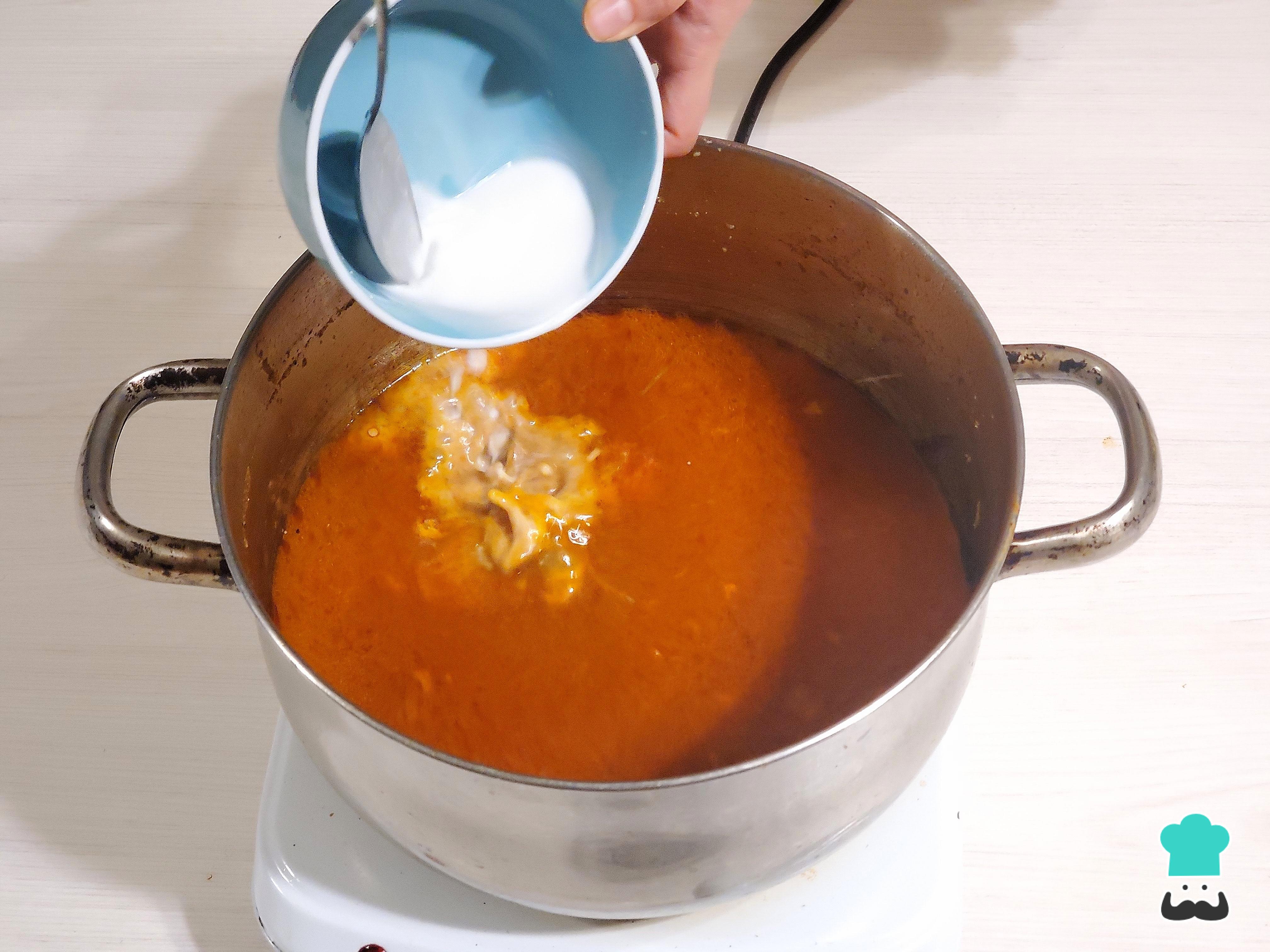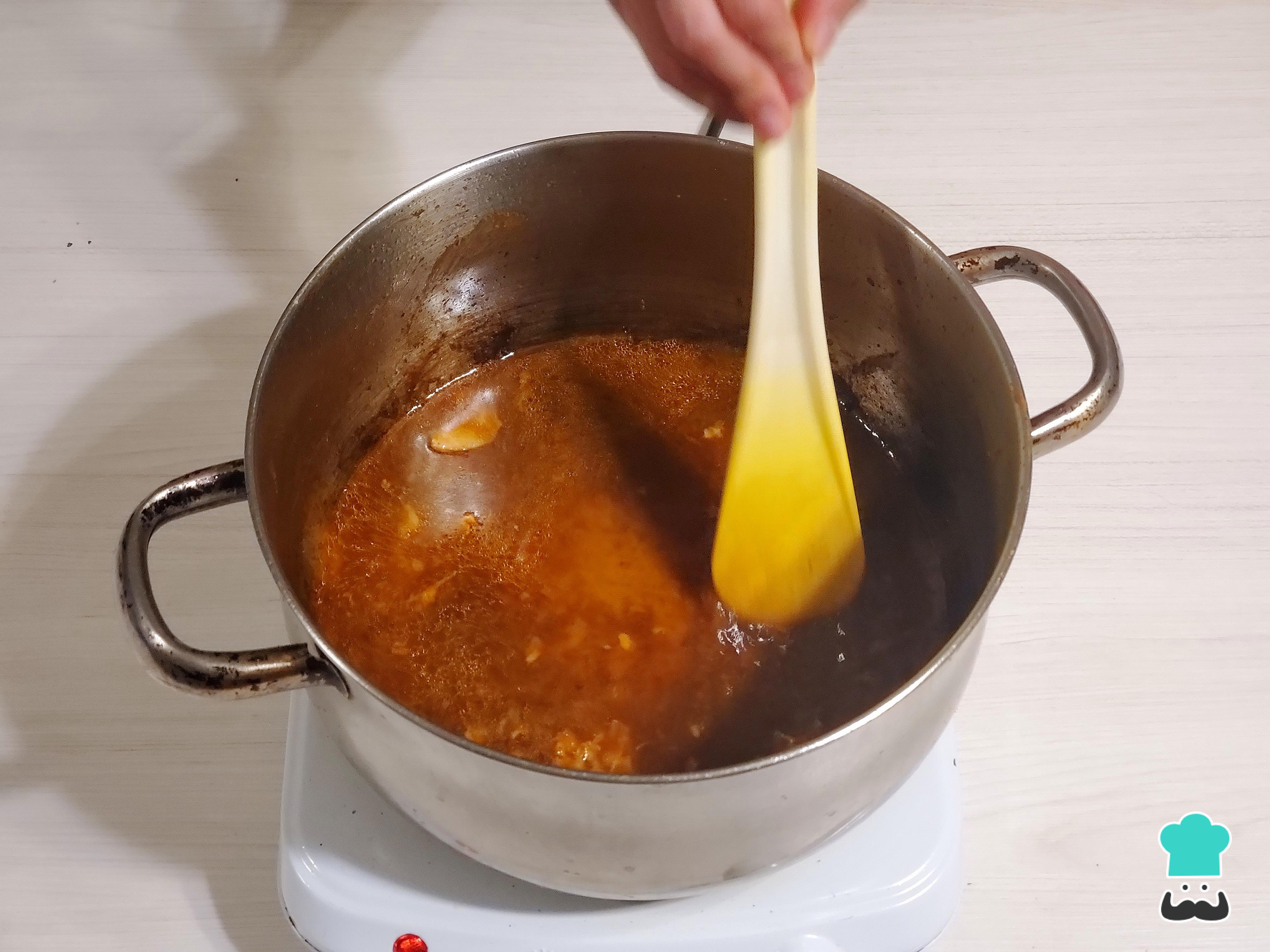 Cuando la proteína esté bien cocida, retírala del caldo y espésalo para tener una salsa. Para espesar, disuelve en un recipiente pequeño la maicena con un chorro de agua hasta que no se vean grumos. Luego, viértelo en la olla y remueve rápidamente con un batidor de globo para que no se formen grumos y empiece a espesar de forma homogénea.