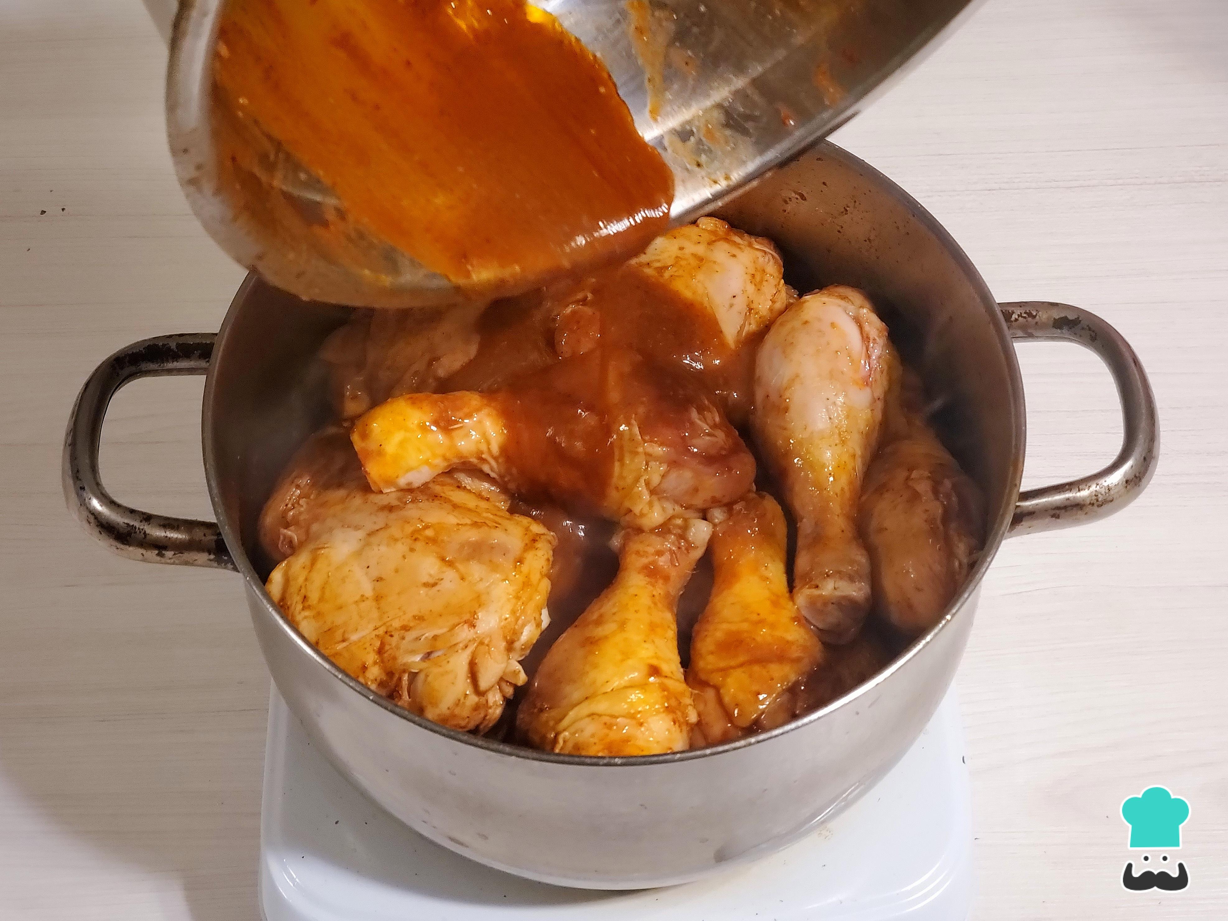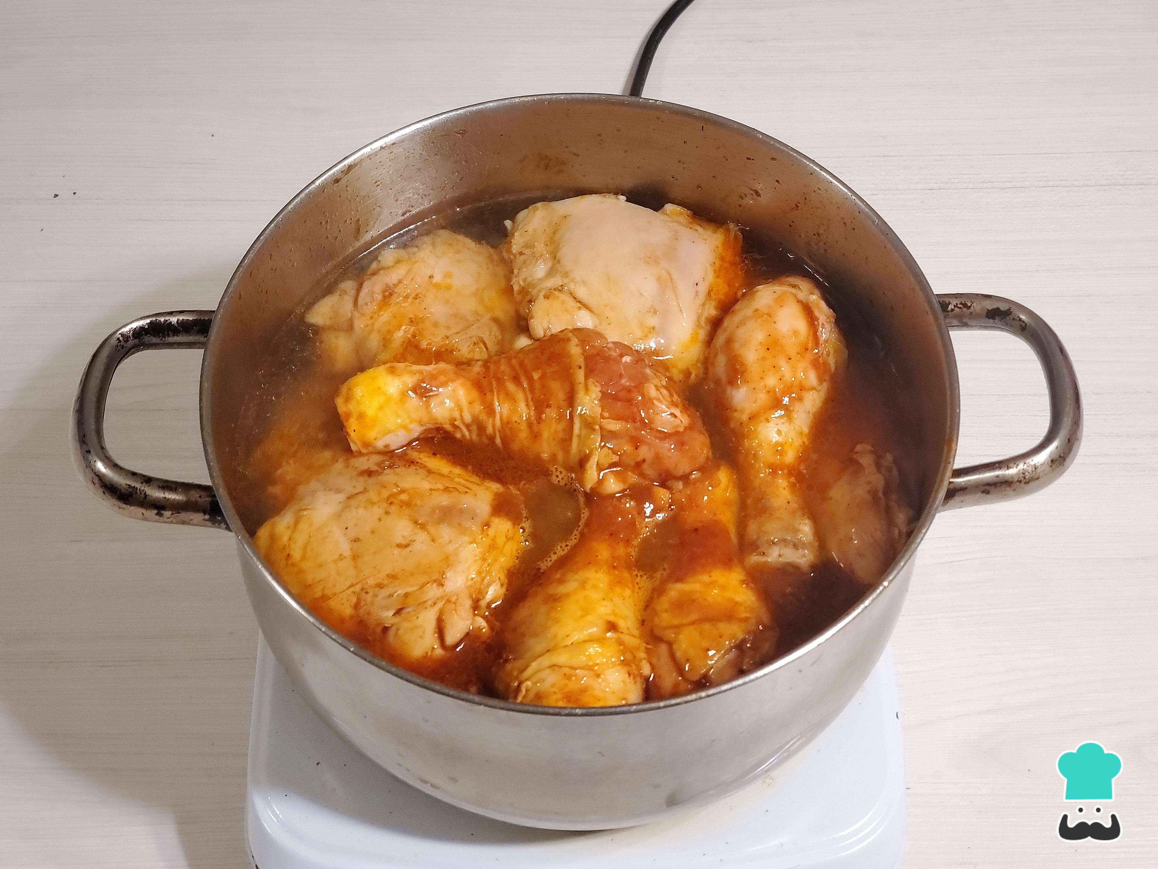 Integra las presas de pollo doradas y cubre con caldo de pollo o agua. Además, no olvides añadir todo el aderezo que se quedó en el bowl.