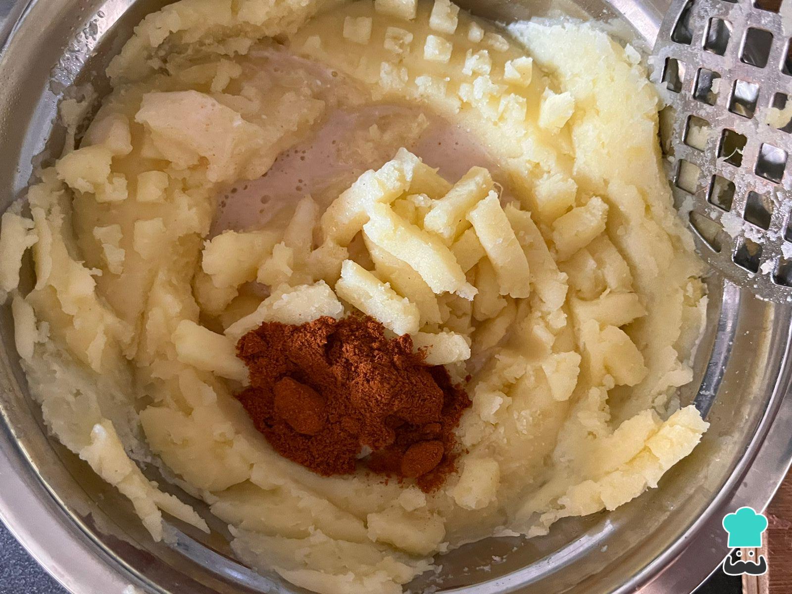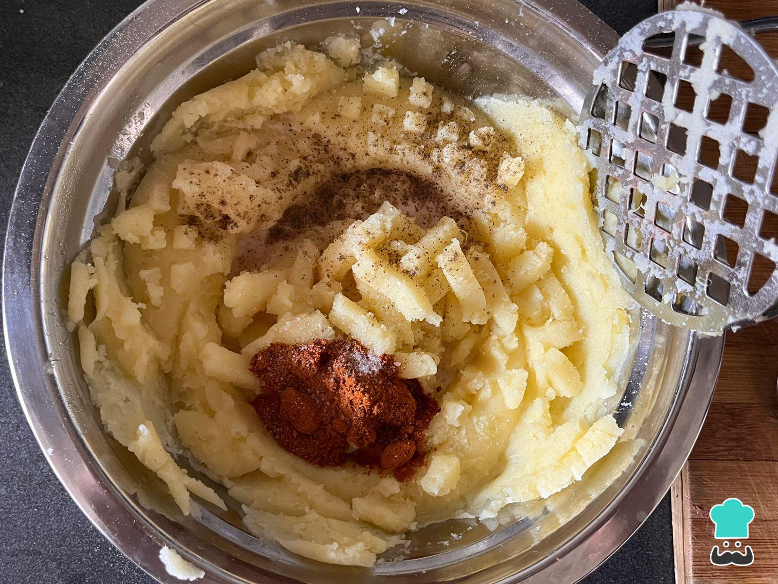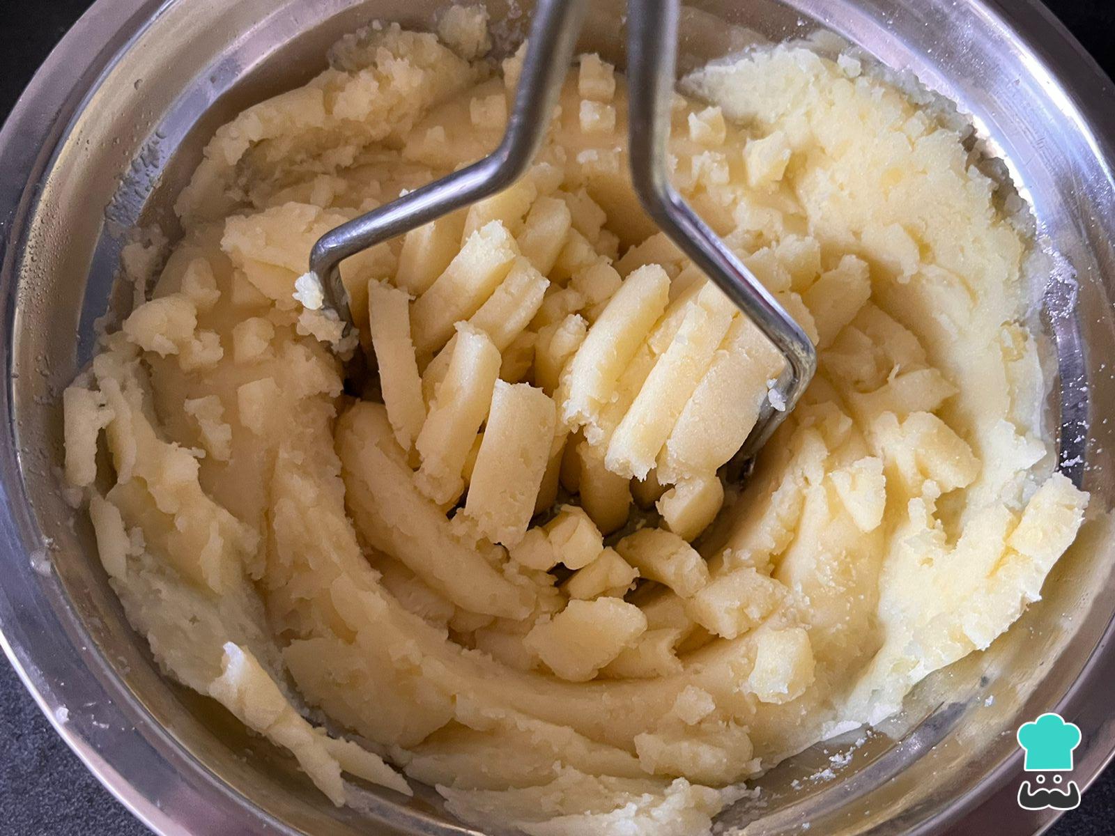 Machaca las papas cocidas con un pisa puré o tenedor hasta que estén suaves.