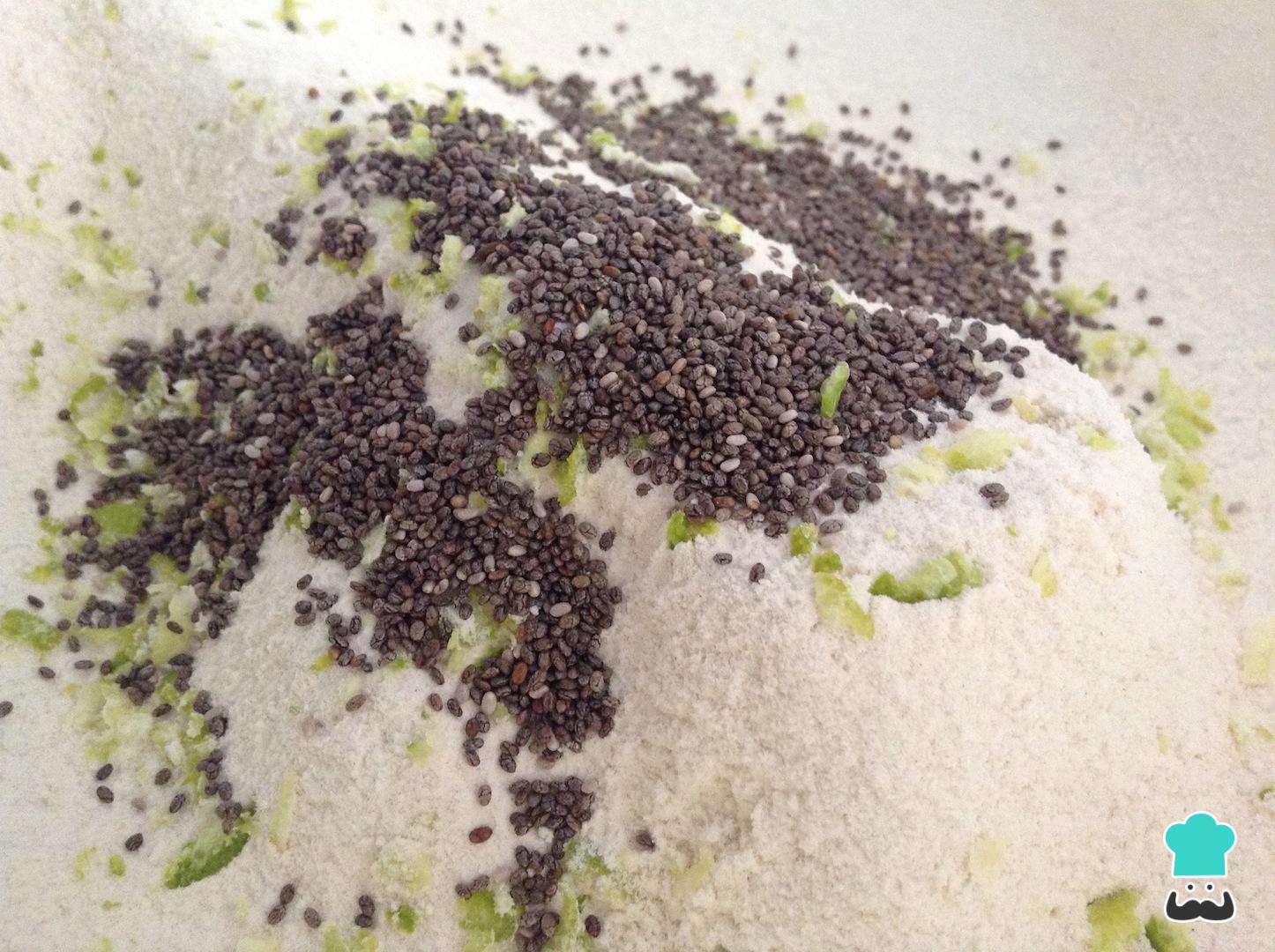 En un bol o tazón debes cernir la harina de trigo, es decir, pasarla por un colador para obtener una masa más fina. Añade el polvo de hornear junto a la ralladura de limón y semillas de chía.
