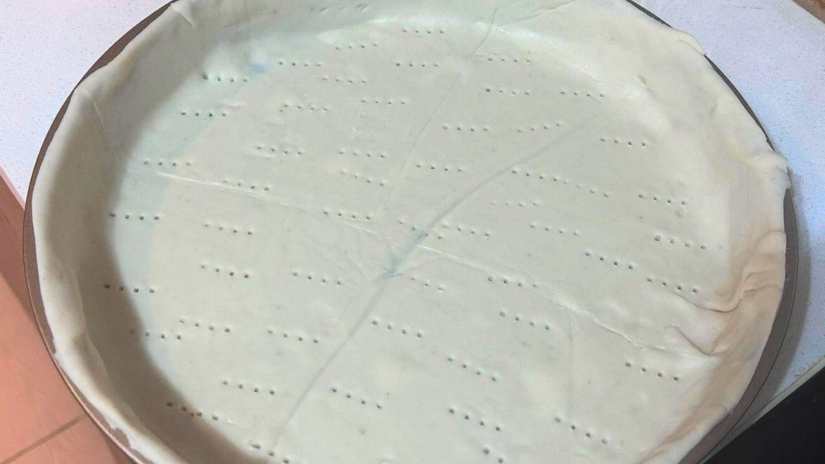 Estira la masa con un rodillo sobre una superficie enharinada y colócala en un molde para quiché o tarta. Ajusta bien los bordes y pincha la base con un tenedor.