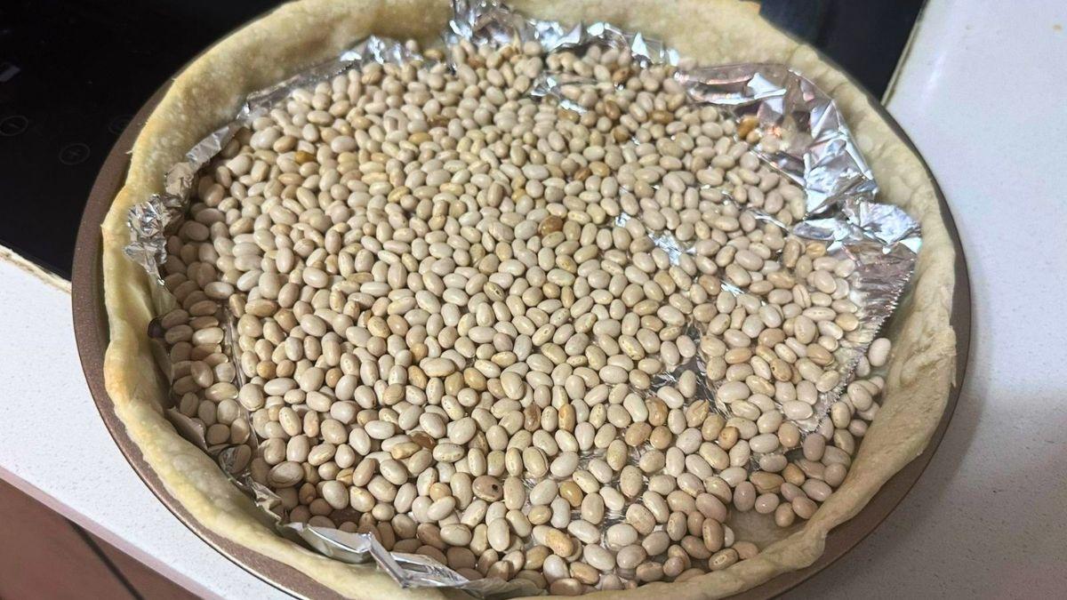 Cubre con papel de horno y agrega peso (pueden ser alubias, garbanzos o arroz). Hornea durante 10 minutos a 180º.