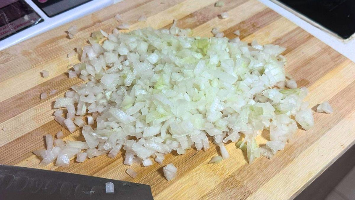 Corta la cebolla en cubos pequeños o en juliana.
